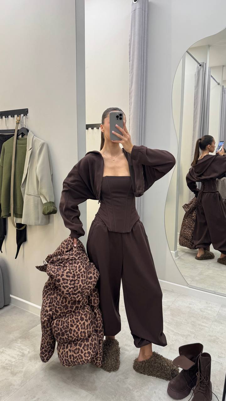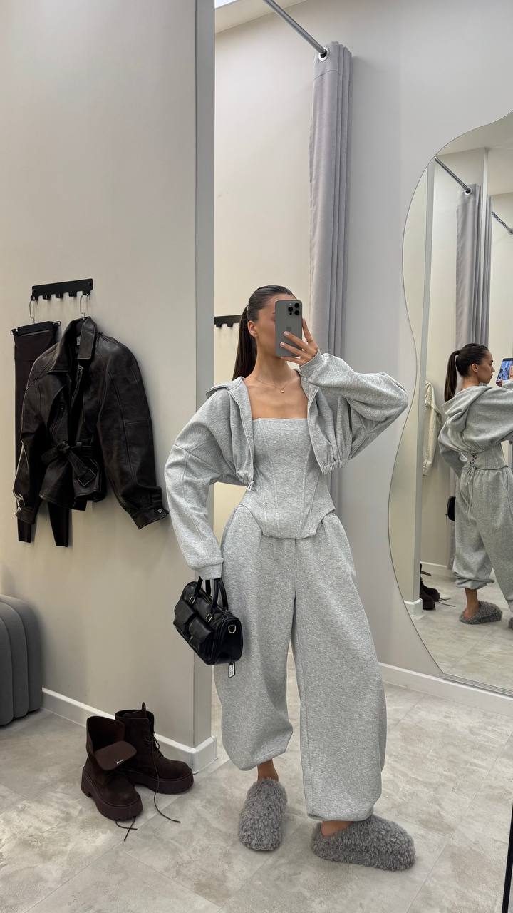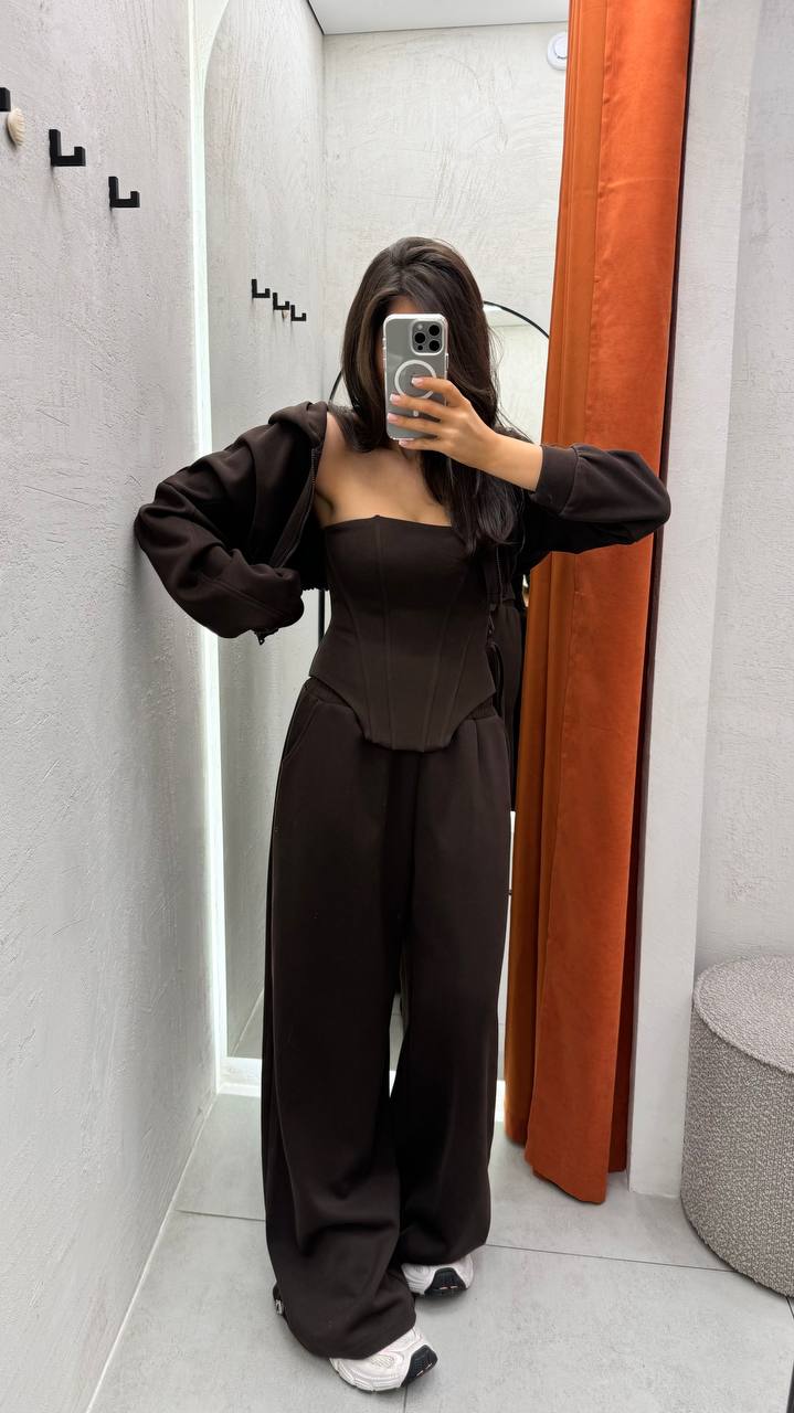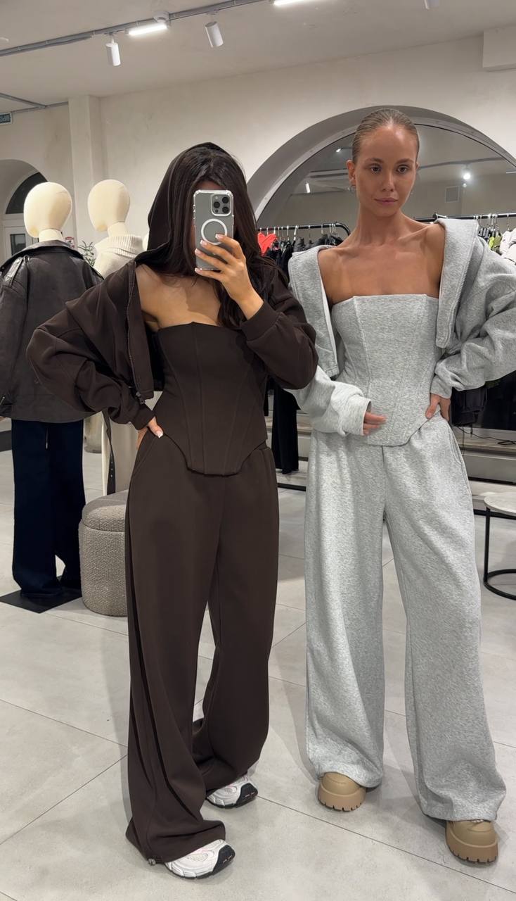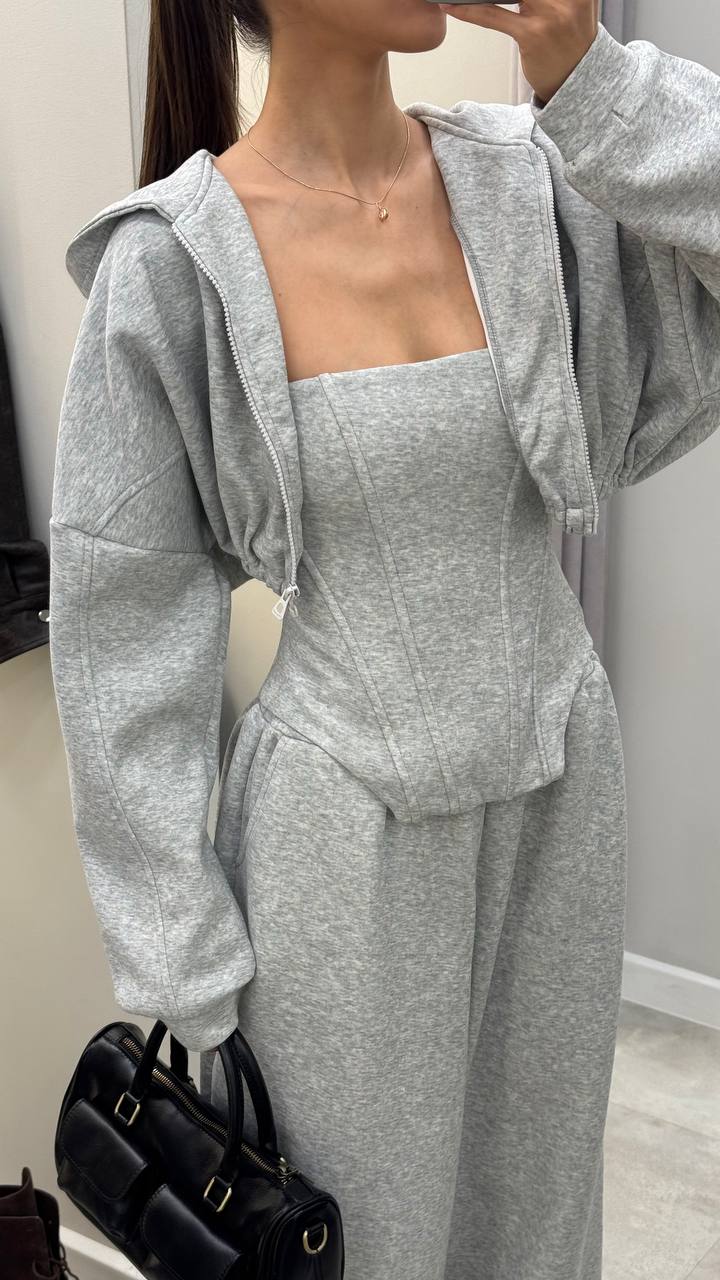 Ten komplet łączy w sobie wygodę dresu z nutą elegancji. Składa się z szerokich spodni, cropped bluzy z kapturem oraz gorsetowego topu, który nadaje całości unikalny charakter. To idealny wybór dla tych, którzy lubią wyglądać modnie, a jednocześnie czuć się swobodnie.