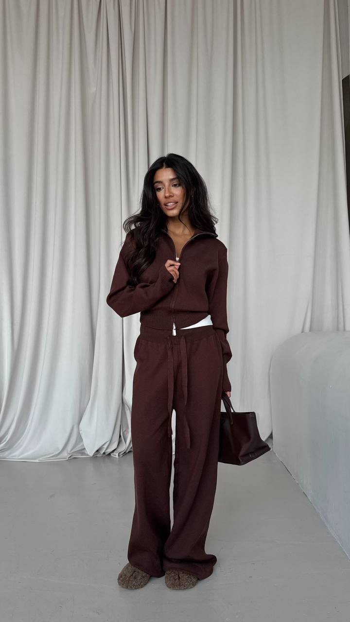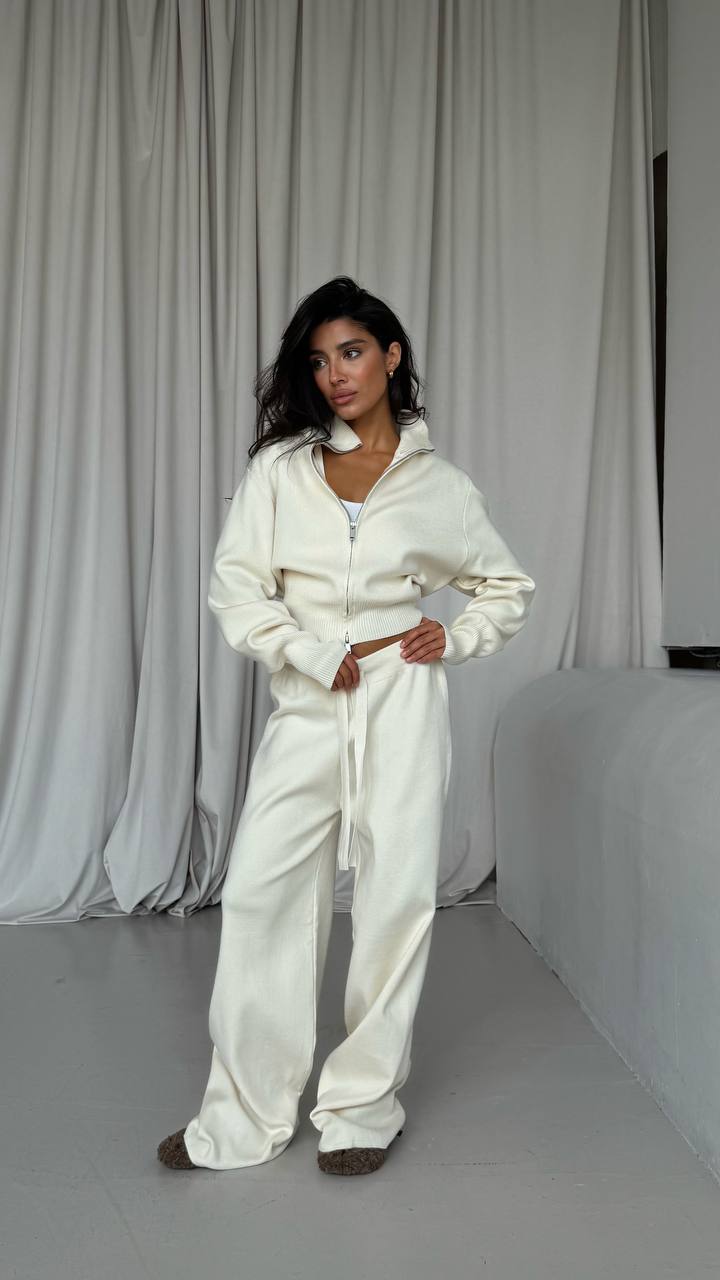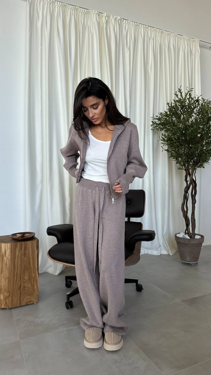 Wykonany z miękkiej, otulającej dzianiny o przyjemnej fakturze. Bluza z kapturem o swobodnym kroju, z szerokimi rękawami i eleganckim wykończeniem na suwak, idealnie współgra z luźnymi spodniami z wysokim stanem i wiązaniem w pasie. Całość układa się lekko i naturalnie, tworząc harmonijną, minimalistyczną sylwetkę.