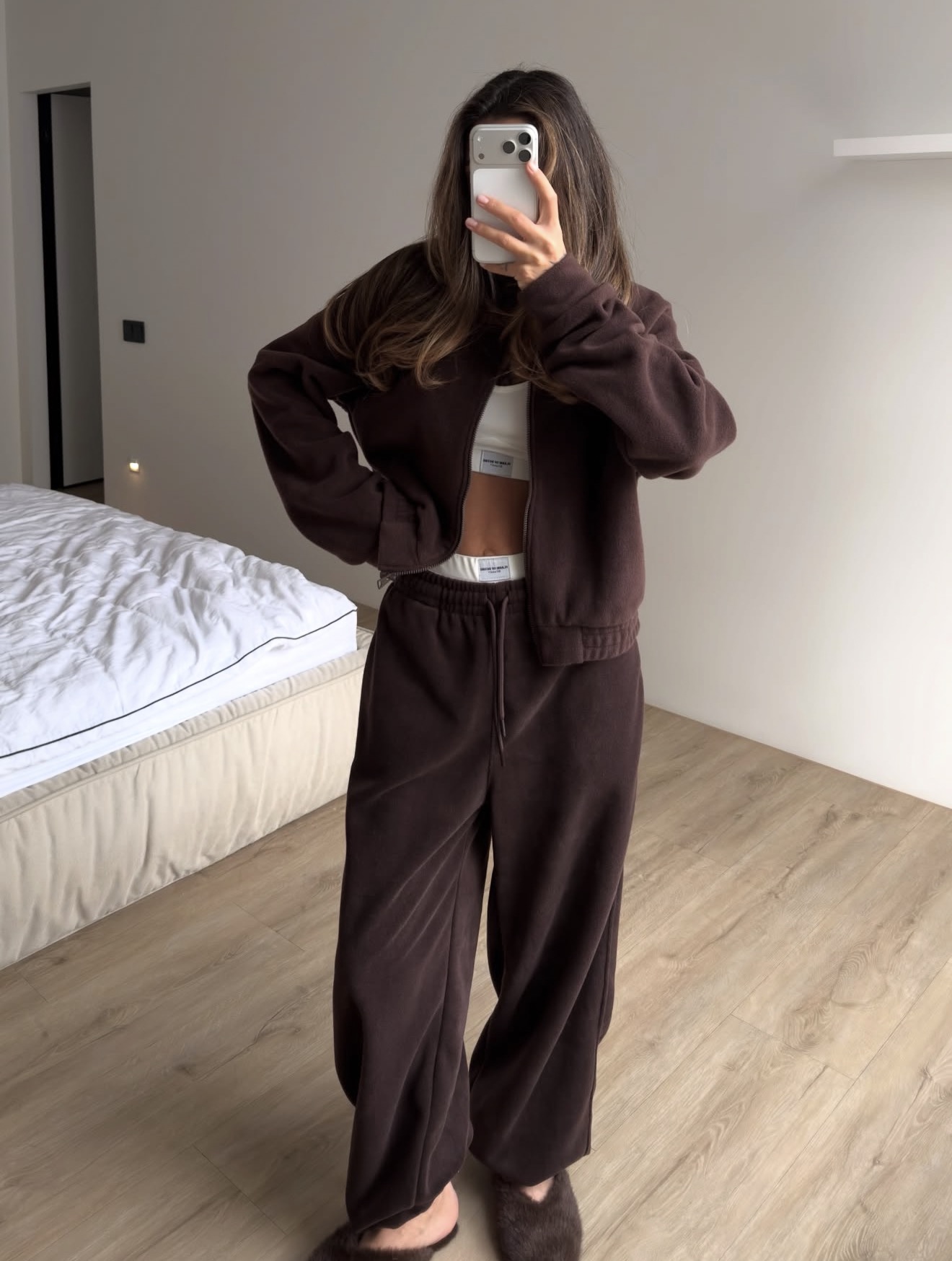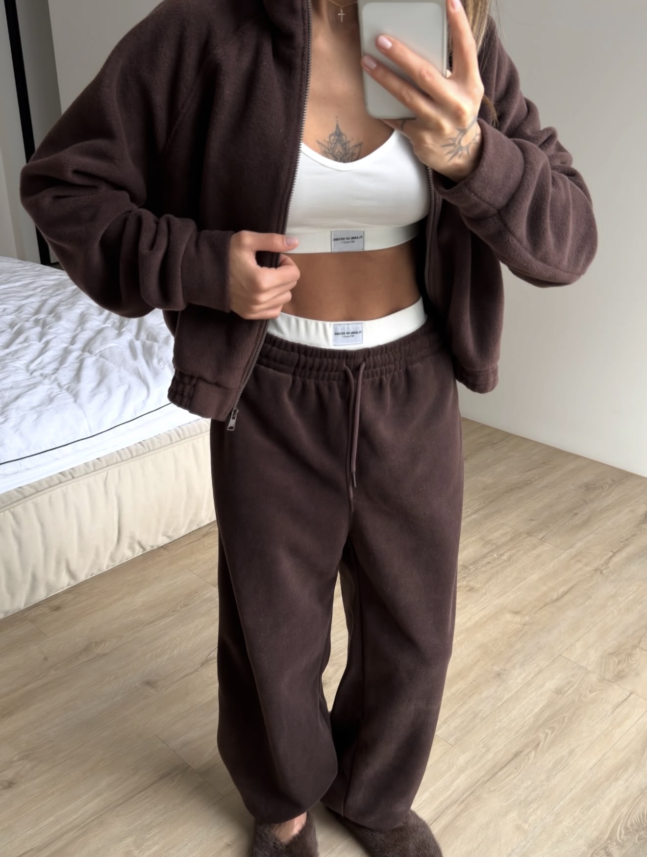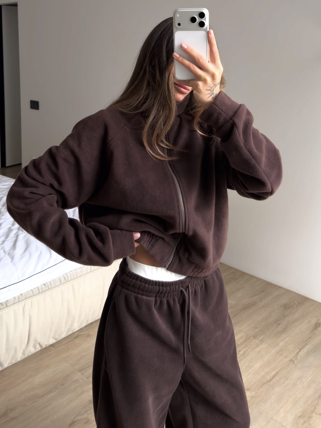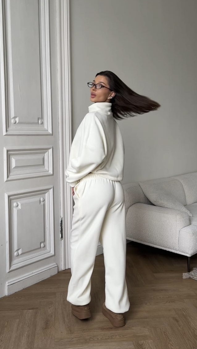 Miękki, przyjemny w dotyku komplet wykonany z wysokiej jakości polaru — idealny na chłodniejsze dni. Luźna bluza z wysokim kołnierzem i zamkiem łączy wygodę z minimalistycznym stylem, a spodnie z prostą nogawką i elastyczną talią zapewniają pełen komfort noszenia.
