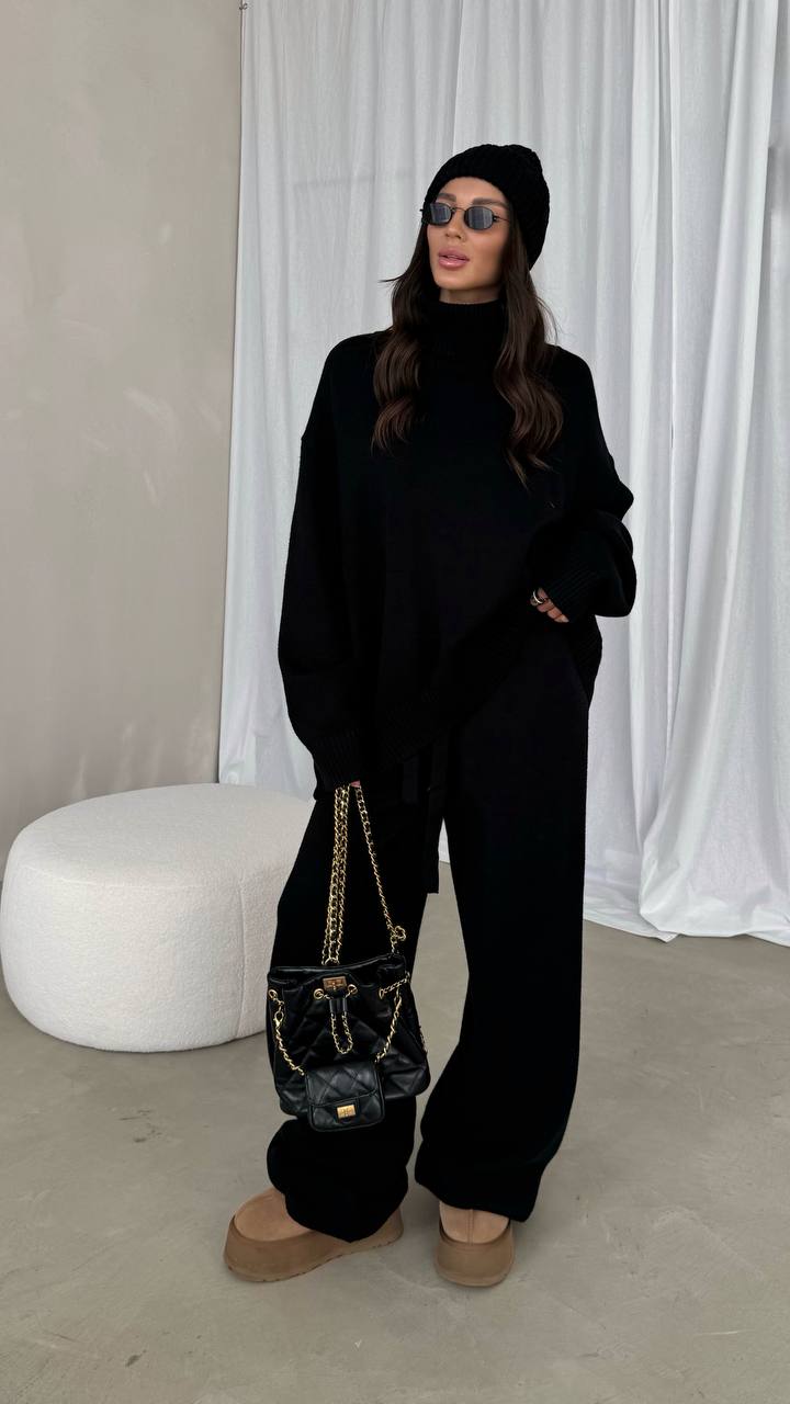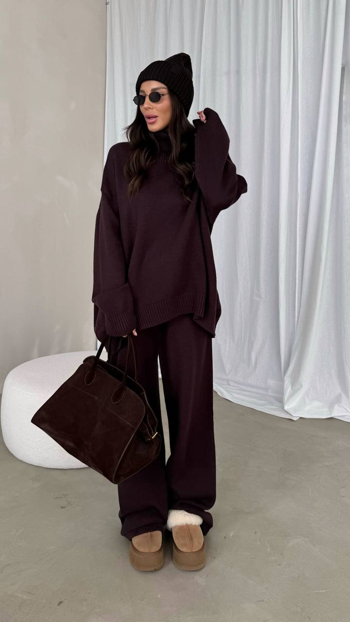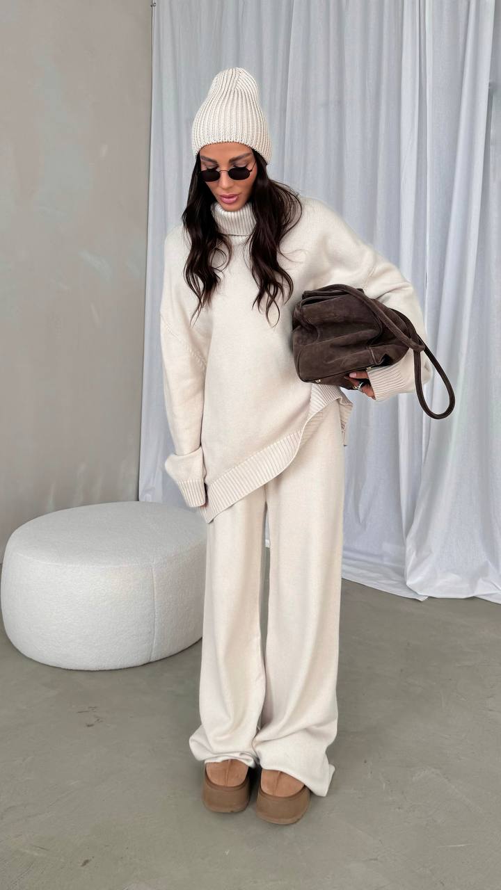Ten wyjątkowy komplet dresowy w odcieniu eleganckiej kości słoniowej, brązie i czerni to kwintesencja nowoczesnego, minimalistycznego designu. Luźny sweter z wysokim golfem otula ciepłem i nadaje sylwetce nonszalanckiego szyku, a szerokie spodnie zapewniają pełną swobodę ruchów.