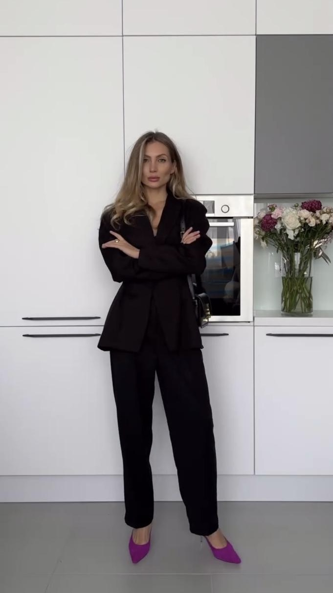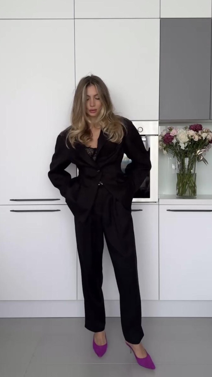 Marynarka ma luźny krój, który nadaje swobodnego charakteru, podczas gdy dopasowana talia podkreśla kobiecą sylwetkę.