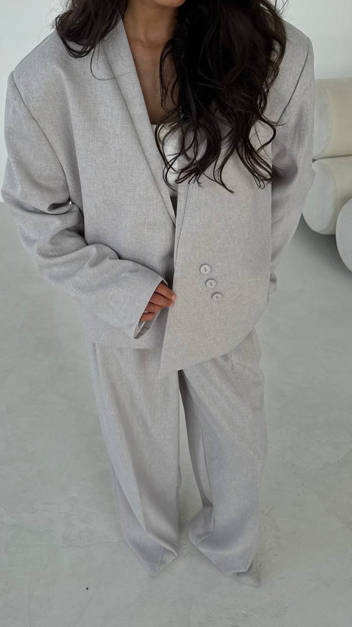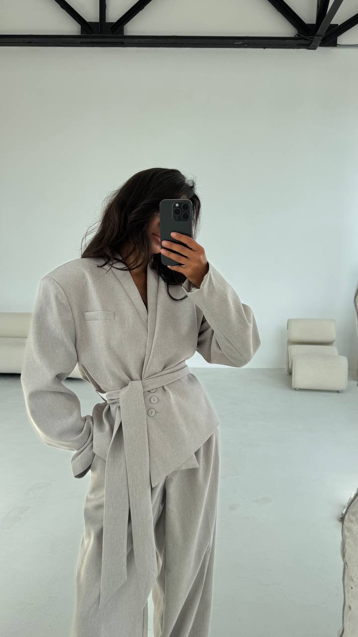 Nowoczesna elegancja w minimalistycznym wydaniu. Ten stylowy komplet w odcieniu jasnej szarości łączy wygodę z szykiem – oversize’owa marynarka z paskiem pięknie podkreśla talię, a szerokie spodnie dodają lekkości sylwetce. Idealny na spotkania biznesowe i wyjątkowe wyjścia. Klasyka z nutą współczesnego stylu.