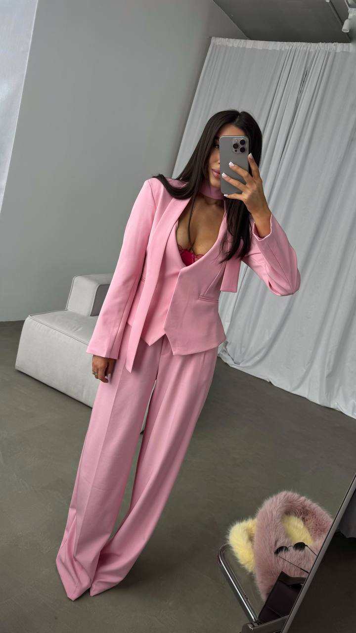 Elegancki garnitur, który łączy klasykę z nowoczesną kobiecością. Marynarka o dopasowanym kroju pięknie podkreśla talię, a dołączony szal może być noszony jako pasek, pozwalając na dowolne modelowanie sylwetki.