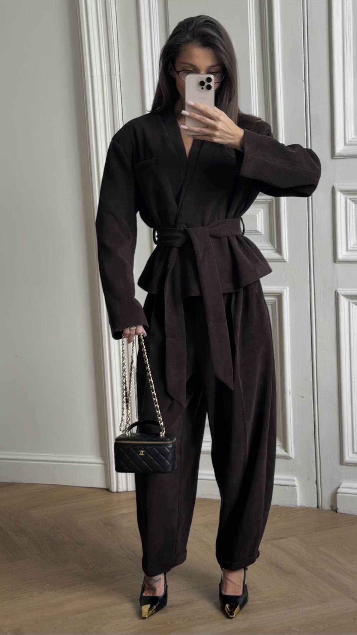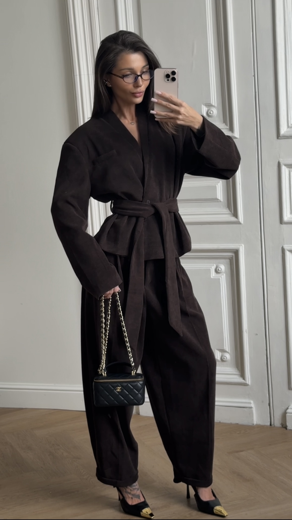 Ten sztruksowy garnitur to połączenie klasyki z nutą trendu – lekko asymetryczna marynarka z paskiem pięknie podkreśla talię, a luźniejsze spodnie z prostą nogawką dodają całości nonszalancji.