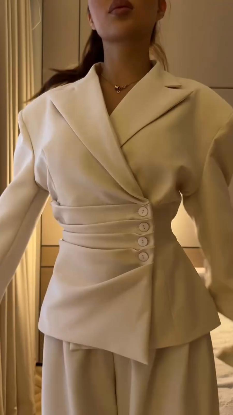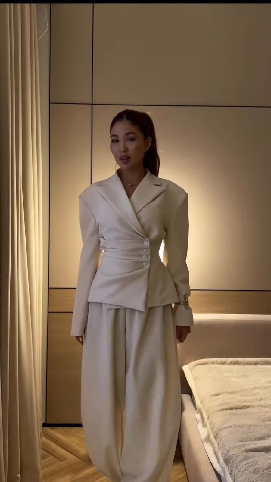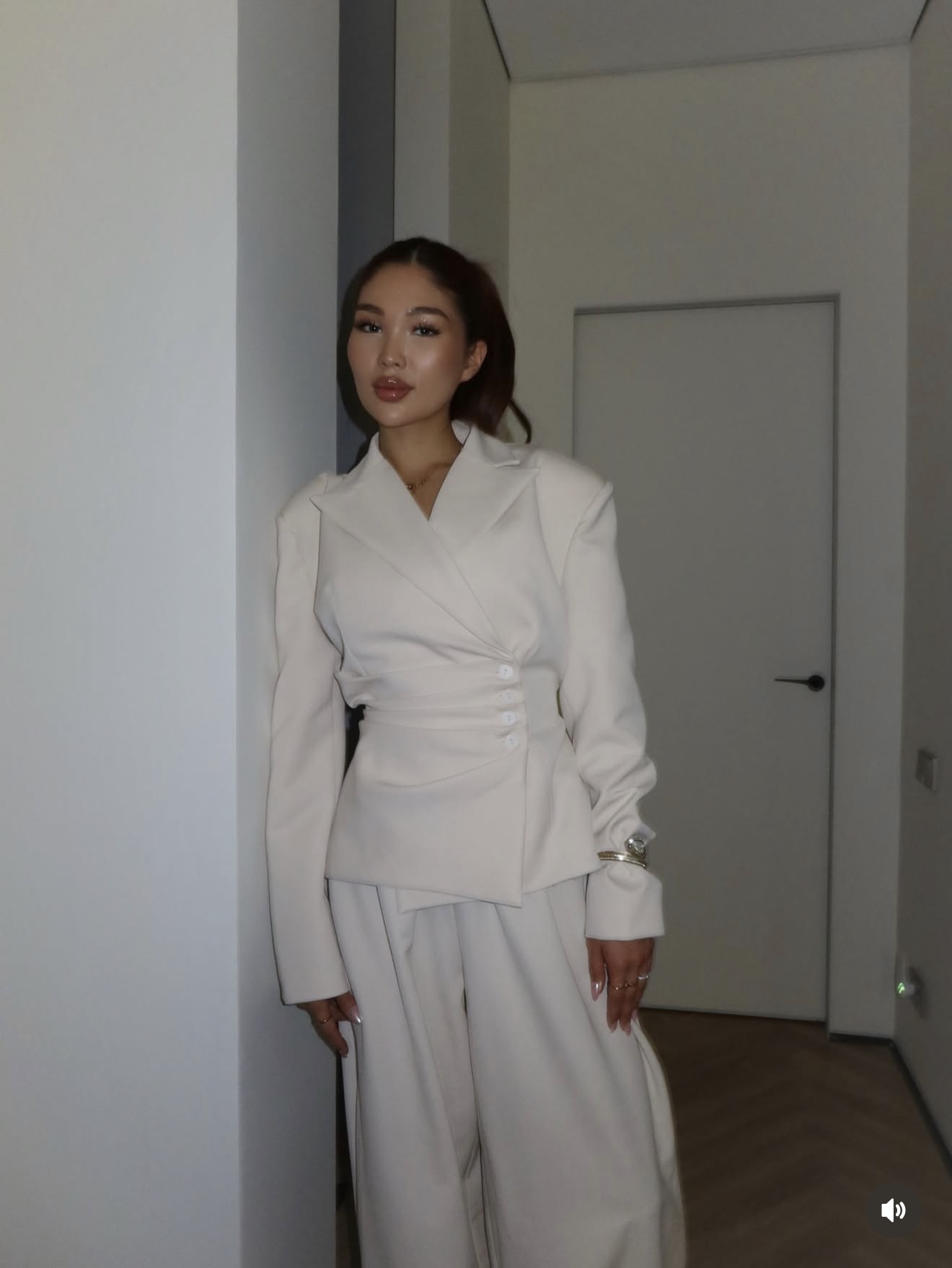 Marynarka z lekko podkreślonymi ramionami i estetyczną wstawką w talii oraz szeroki krój spodni zakończony gumką tworzą sylwetkę smukłą, ale swobodną – gotową na każdy dzień i każdą okazję.