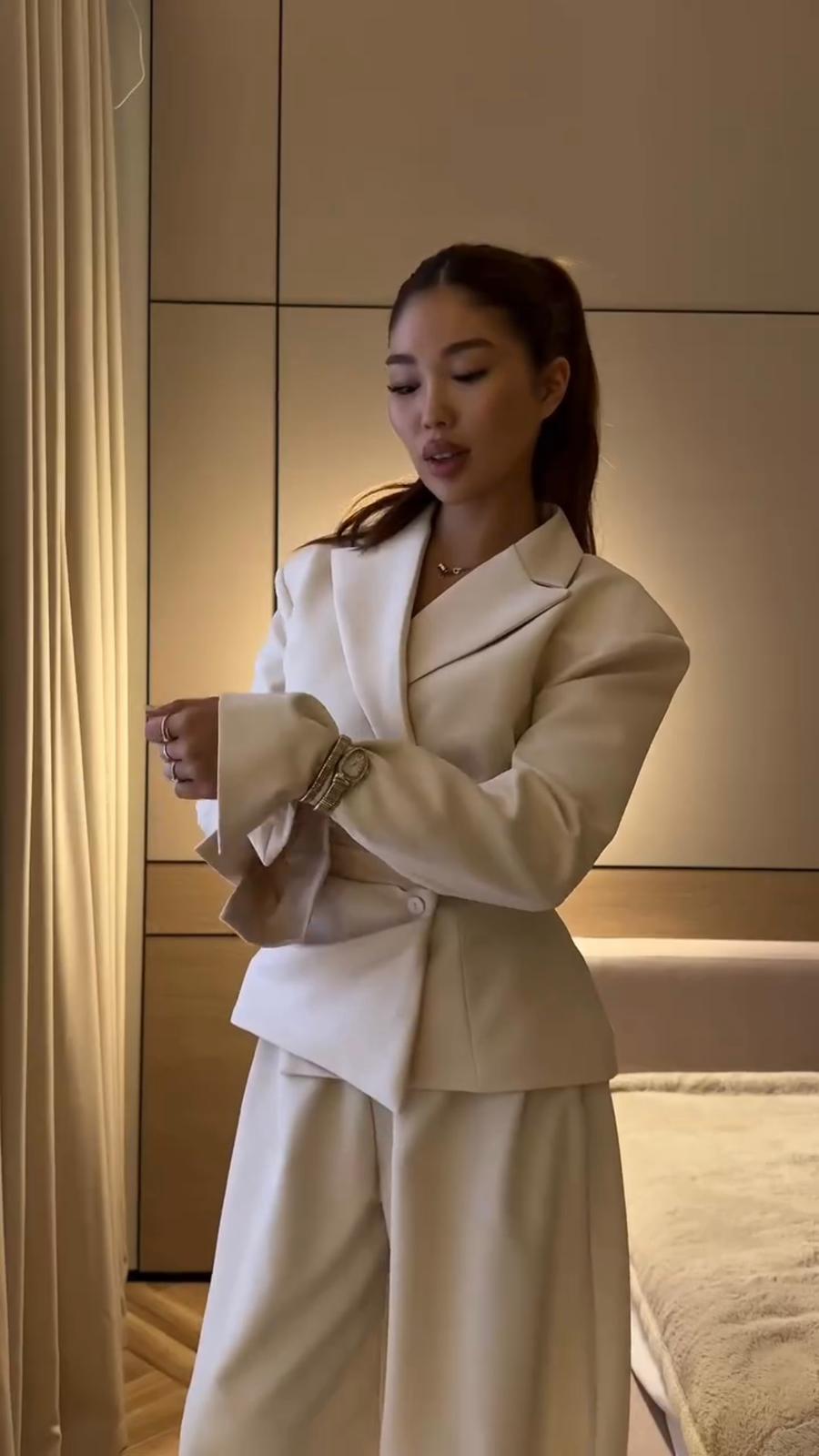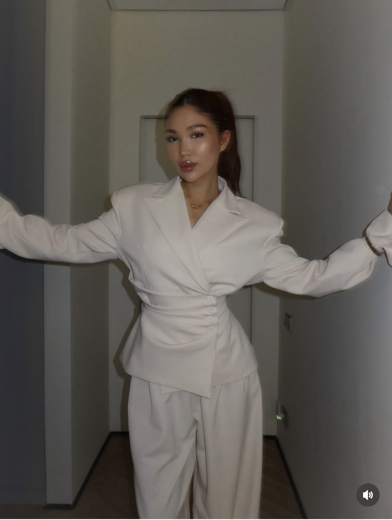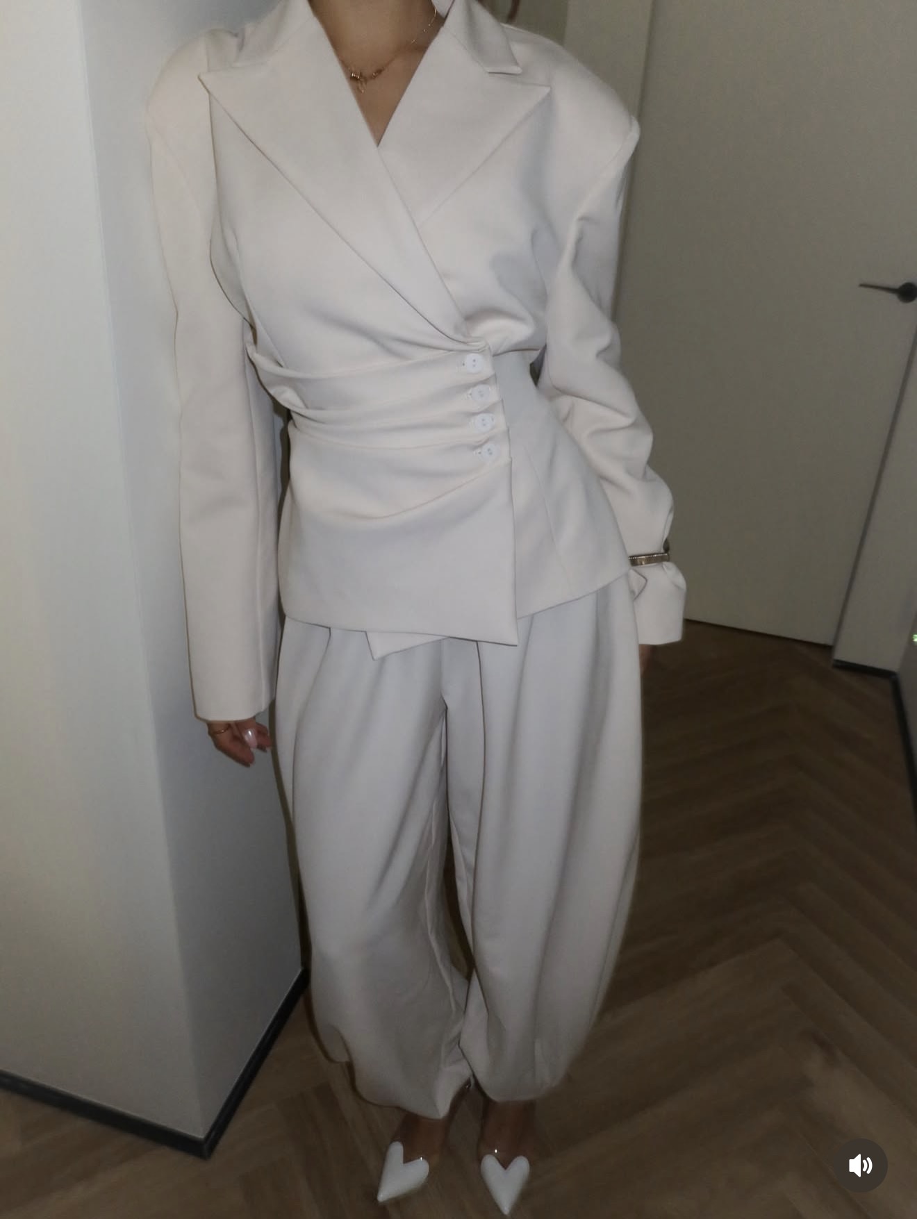 Marynarka z lekko podkreślonymi ramionami i estetyczną wstawką w talii oraz szeroki krój spodni zakończony gumką tworzą sylwetkę smukłą, ale swobodną – gotową na każdy dzień i każdą okazję.