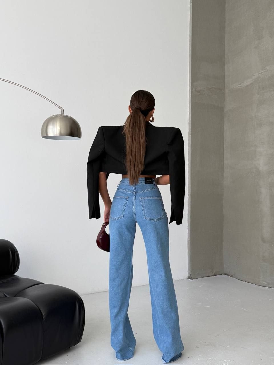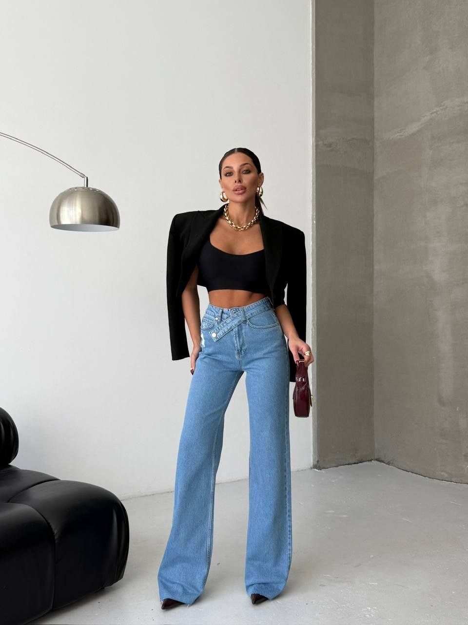 Nowoczesny fason z wysokim stanem i krzyżowym zapięciem w talii pięknie modeluje sylwetkę, podkreślając talię i wydłużając nogi. Szeroka, prosta nogawka nadaje całości modowego charakteru inspirowanego wybiegami.
