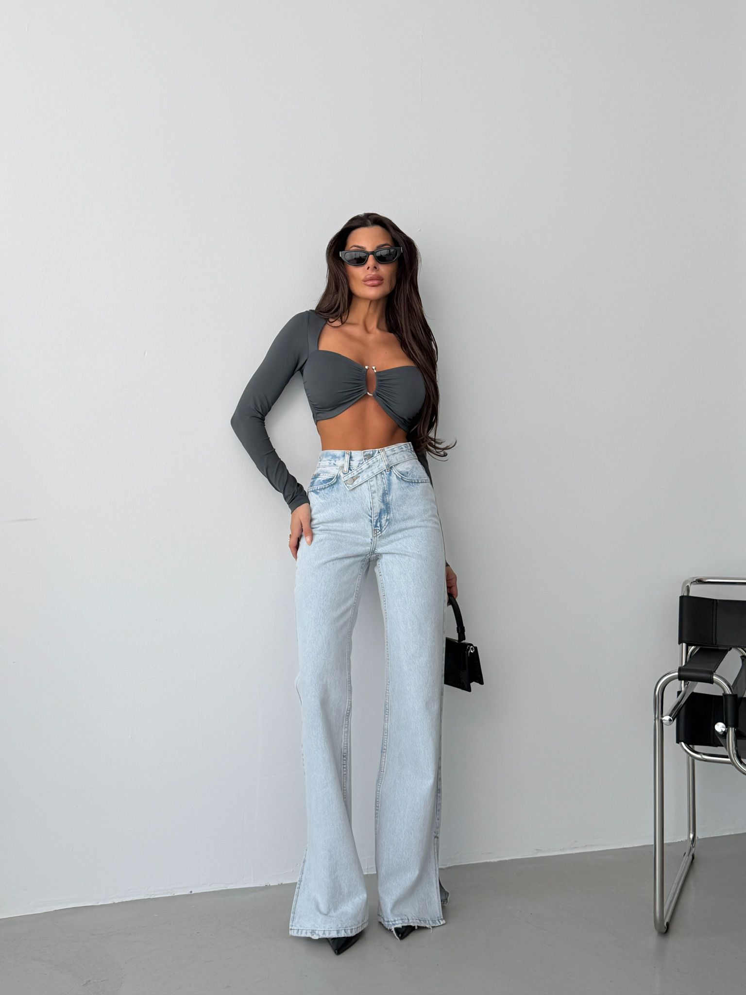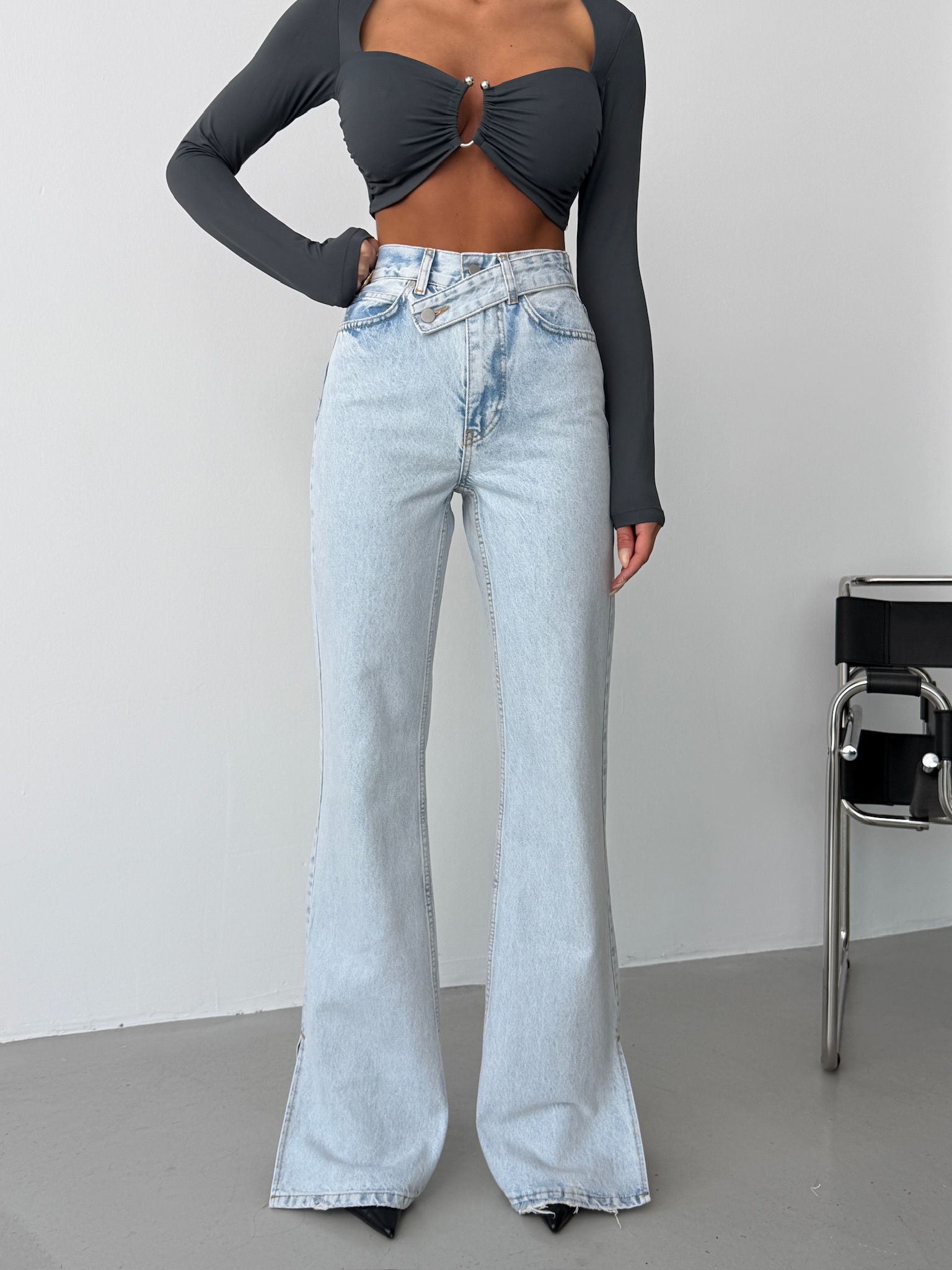 Nowoczesny fason z wysokim stanem i krzyżowym zapięciem w talii pięknie modeluje sylwetkę, podkreślając talię i wydłużając nogi. Szeroka, prosta nogawka nadaje całości modowego charakteru inspirowanego wybiegami.