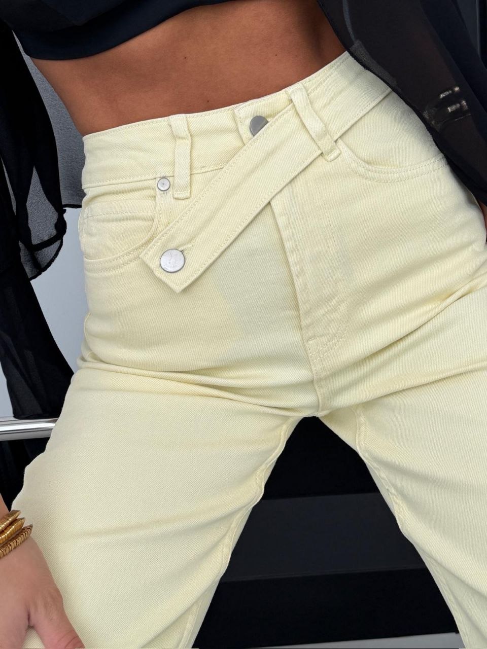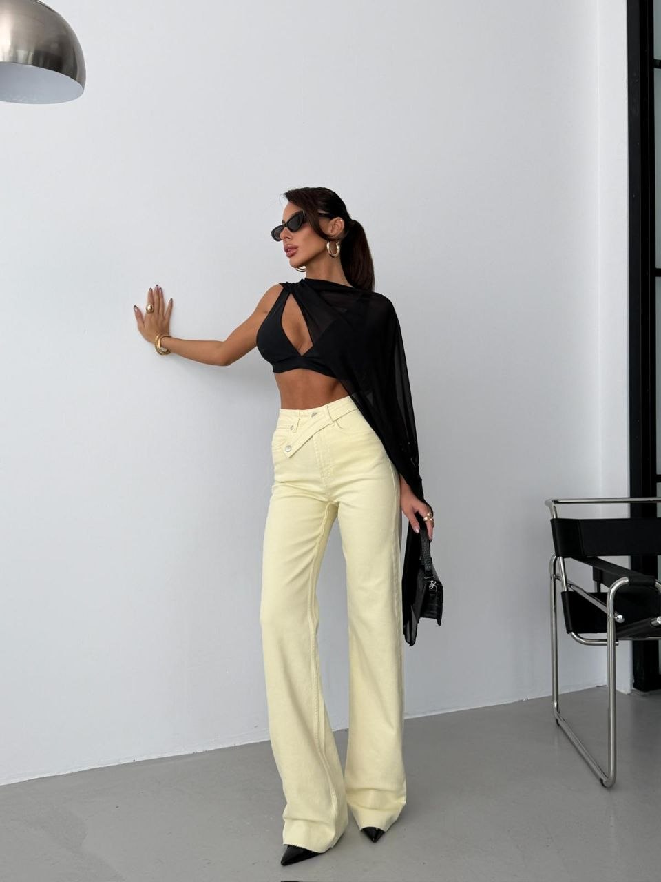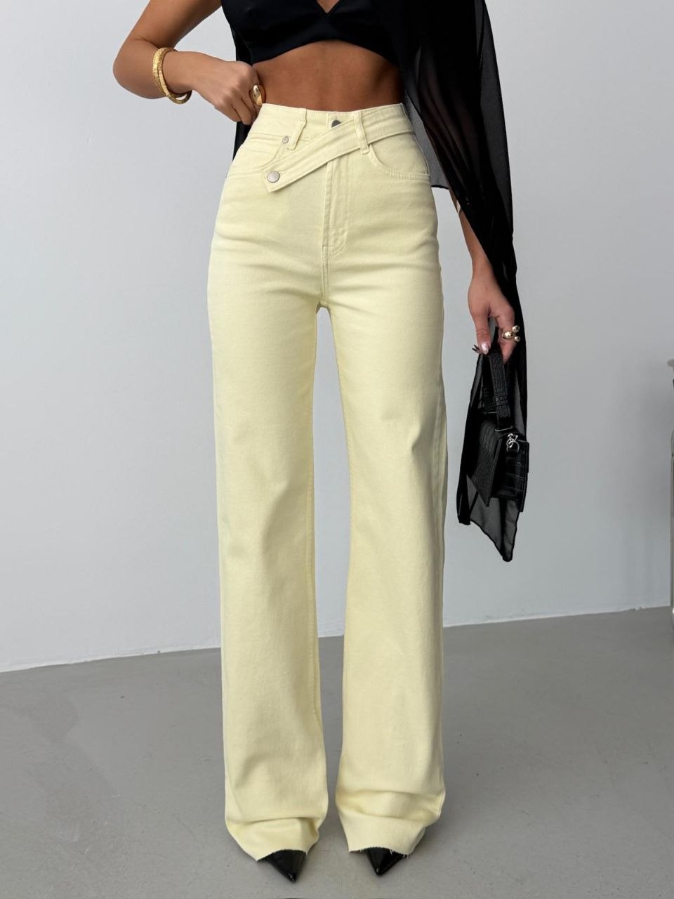Nowoczesny fason z wysokim stanem i krzyżowym zapięciem w talii pięknie modeluje sylwetkę, podkreślając talię i wydłużając nogi. Szeroka, prosta nogawka nadaje całości modowego charakteru inspirowanego wybiegami.