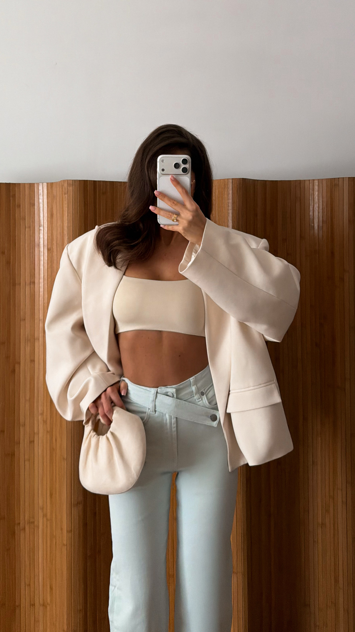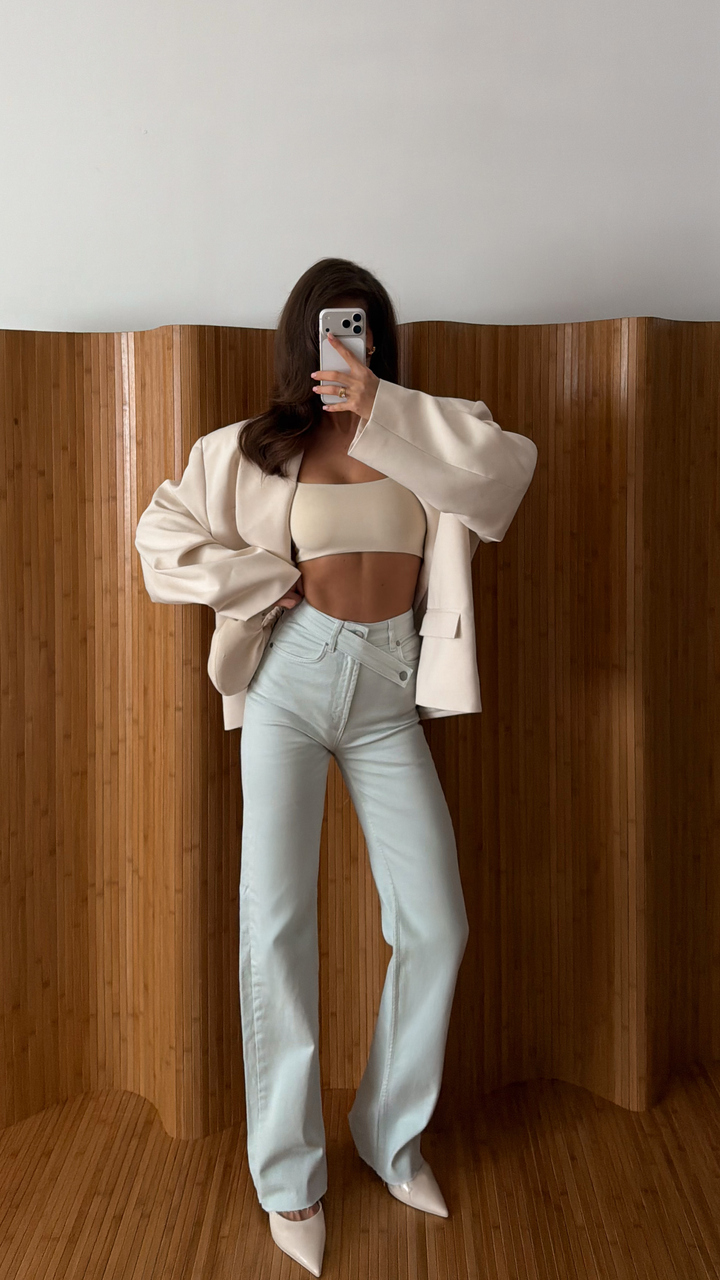 Nowoczesny fason z wysokim stanem i krzyżowym zapięciem w talii pięknie modeluje sylwetkę, podkreślając talię i wydłużając nogi. Szeroka, prosta nogawka nadaje całości modowego charakteru inspirowanego wybiegami.
