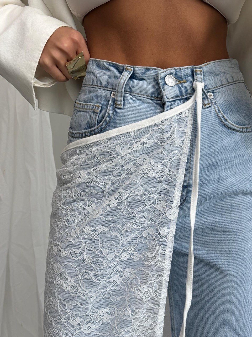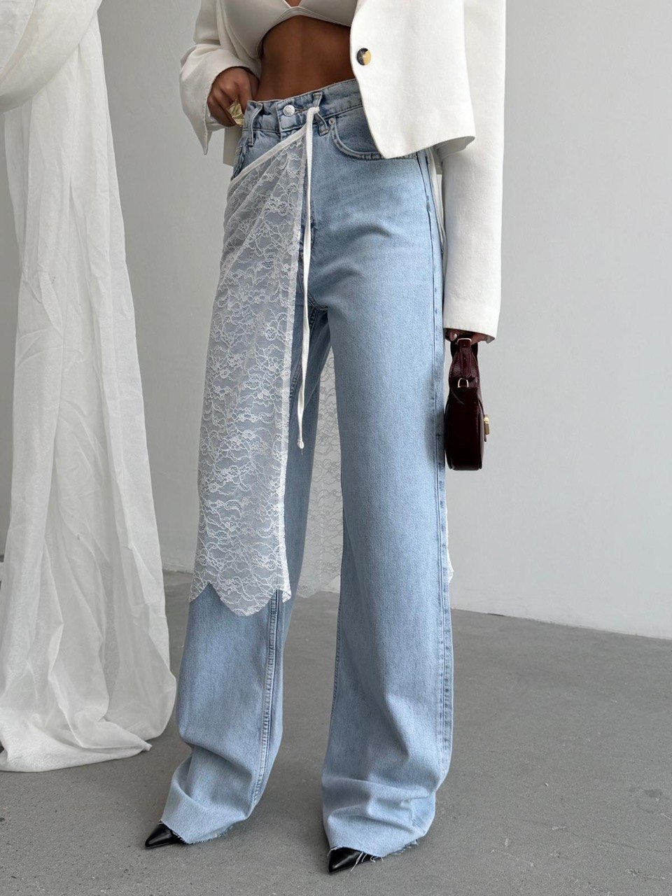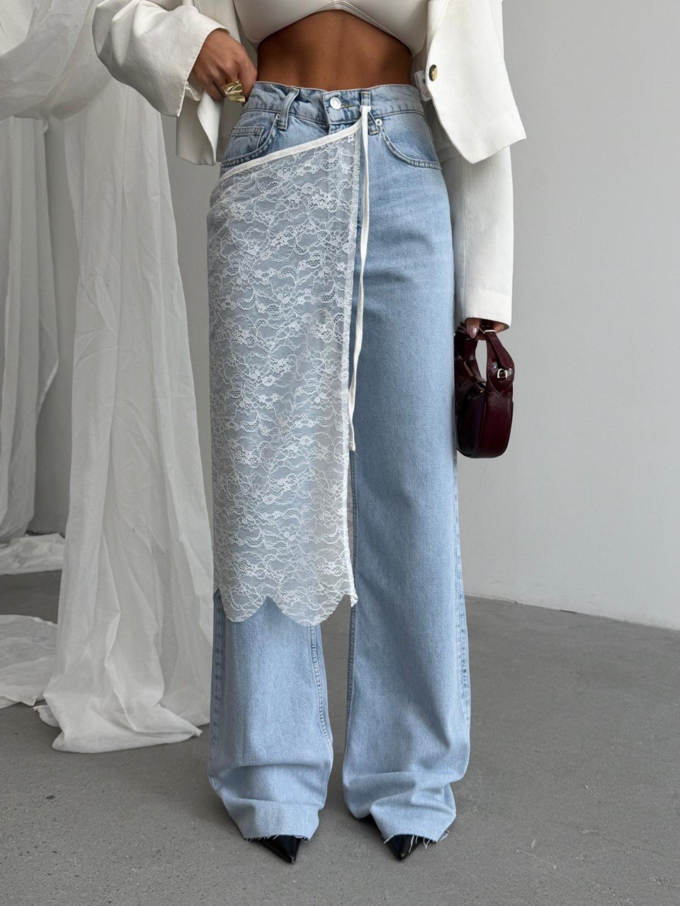 Nowoczesny fason z wysokim stanem i krzyżowym zapięciem w talii pięknie modeluje sylwetkę, podkreślając talię i wydłużając nogi. Szeroka, prosta nogawka nadaje całości modowego charakteru inspirowanego wybiegami.