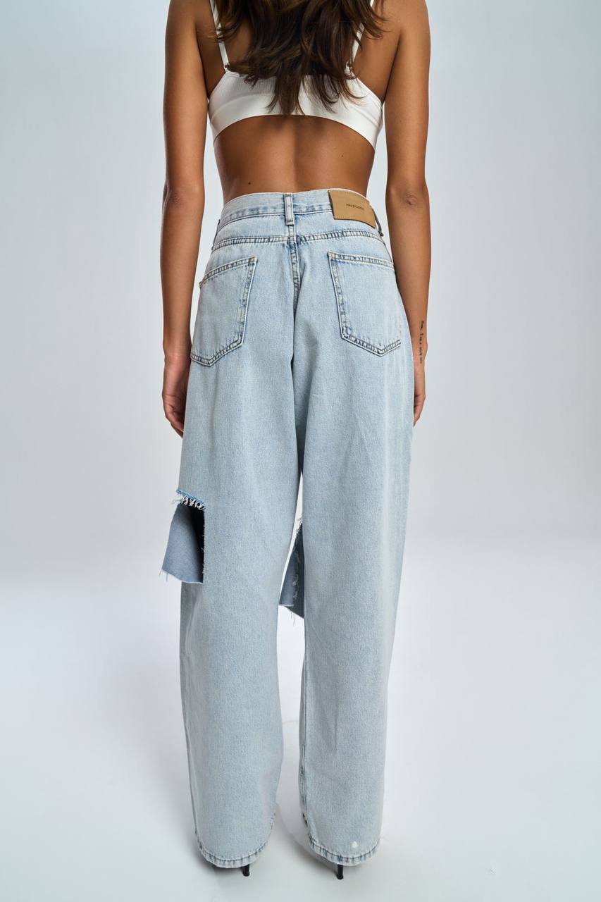 Luźny fason, surowe wykończenie i wyraziste przetarcie na udzie tworzą look, który łączy nonszalancję z modowym pazurem.