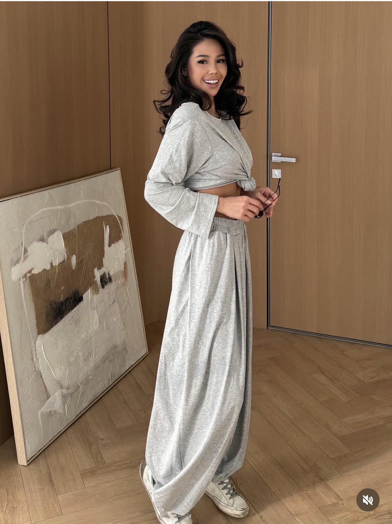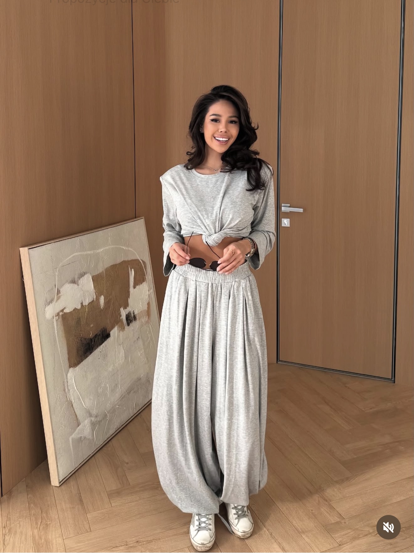 Szerokie spodnie przyciągają uwagę oryginalnym wykończeniem nogawek — specjalne otwory tworzą efekt ściągaczy, które nie uciskają łydek, a jednocześnie nadają całości modowy, dopracowany charakter.