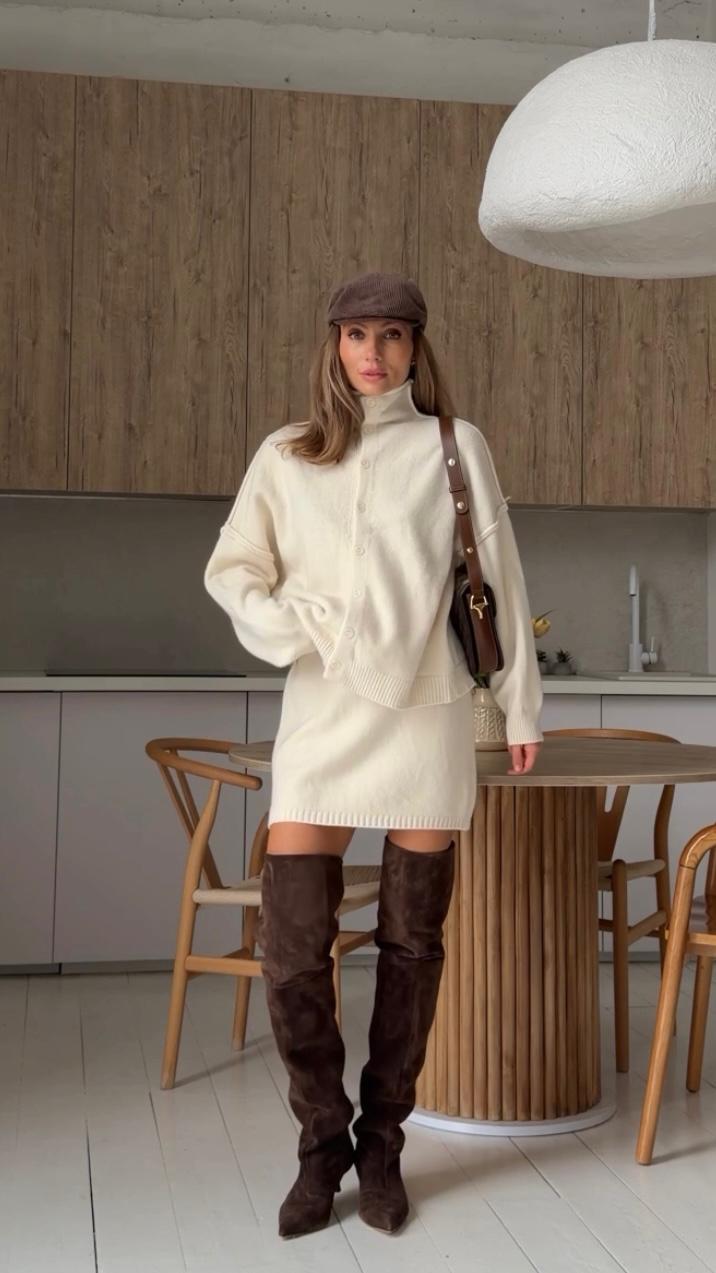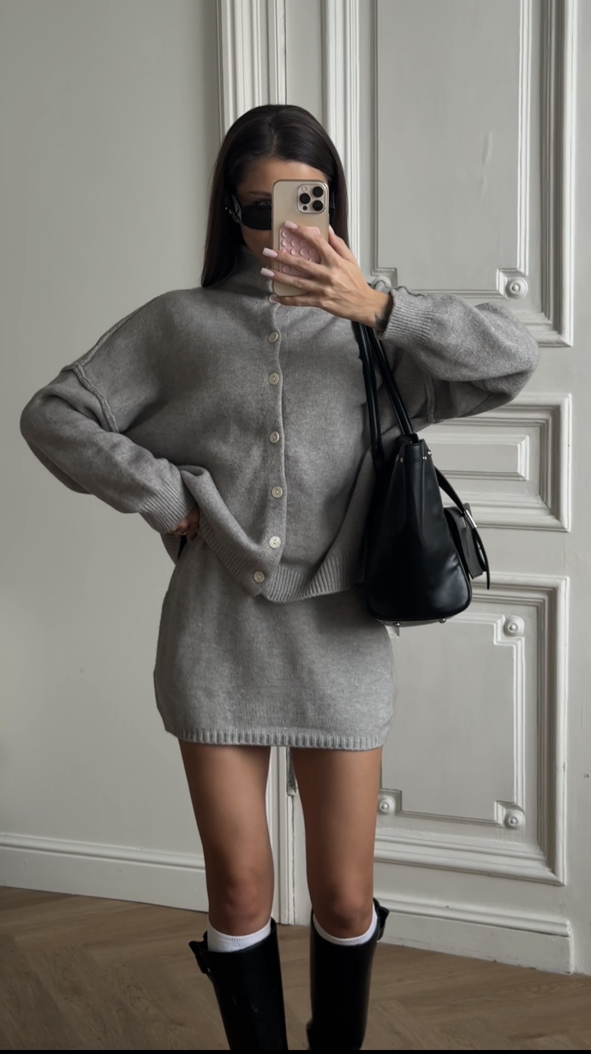 Komplet z miękkiej dzianiny to połączenie wygody i elegancji w najlepszym wydaniu. Sweter o lekko oversize’owym kroju z wysokim kołnierzem i guzikami tworzy idealne duo z dopasowaną spódniczką mini. Całość prezentuje się stylowo, kobieco i wyjątkowo przytulnie.