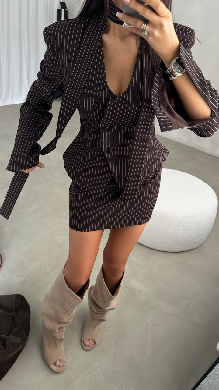 Marynarka o perfekcyjnie skrojonym fasonie pięknie podkreśla talię i nadaje sylwetce wyrazistości, a spódniczka mini w tym samym wzorze dodaje całości kobiecego charakteru. Klasyczne prążki przełamane nowoczesnym designem sprawiają, że zestaw wygląda niezwykle modnie i ponadczasowo.