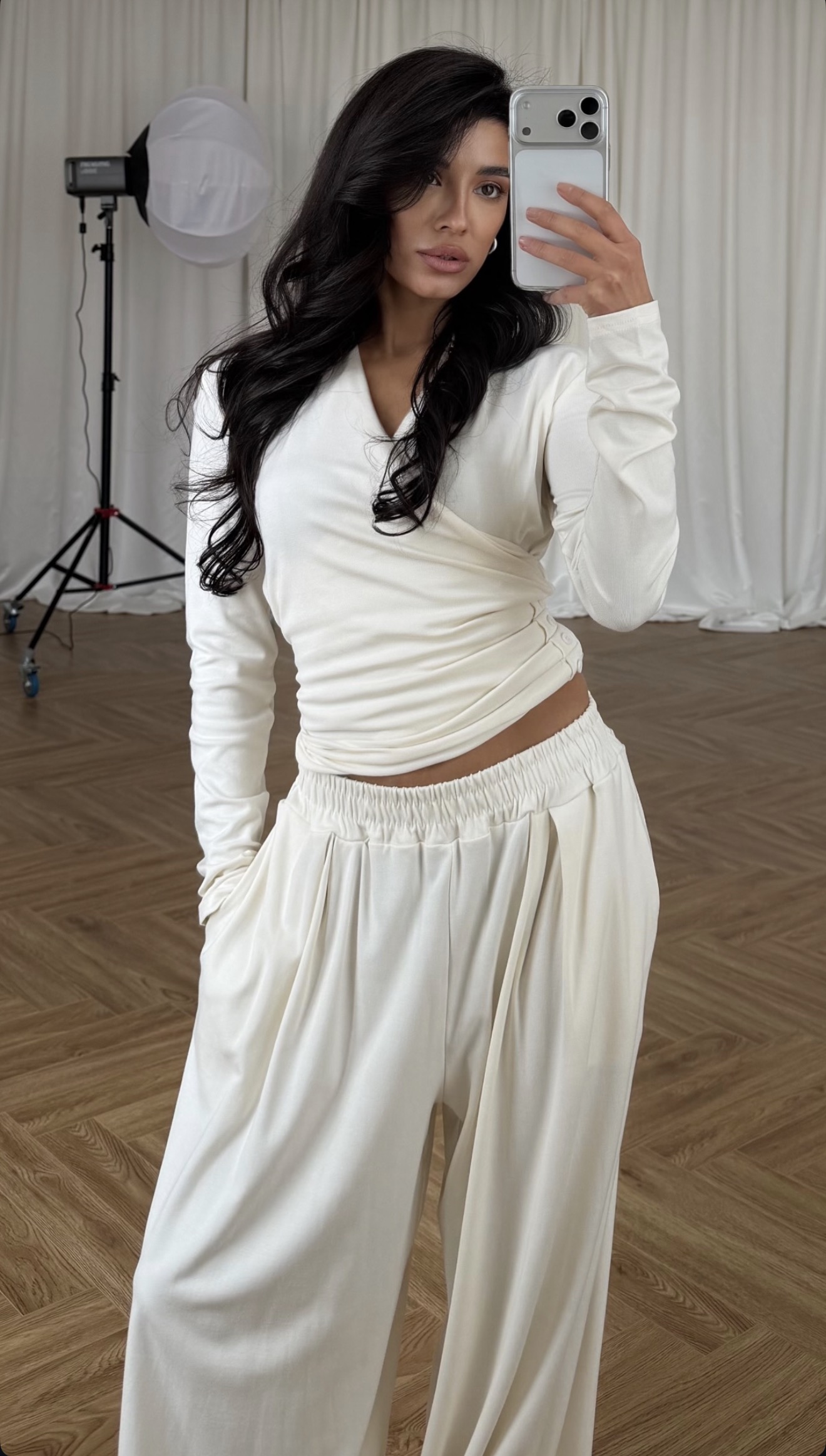 Góra kompletu wyróżnia się komfortowym krojem, który subtelnie układa się na sylwetce, zapewniając swobodę ruchów i lekkość noszenia. Spodnie o prostych, luźnych nogawkach tworzą spójną całość, optycznie wydłużając nogi i nadając sylwetce nowoczesnych proporcji.