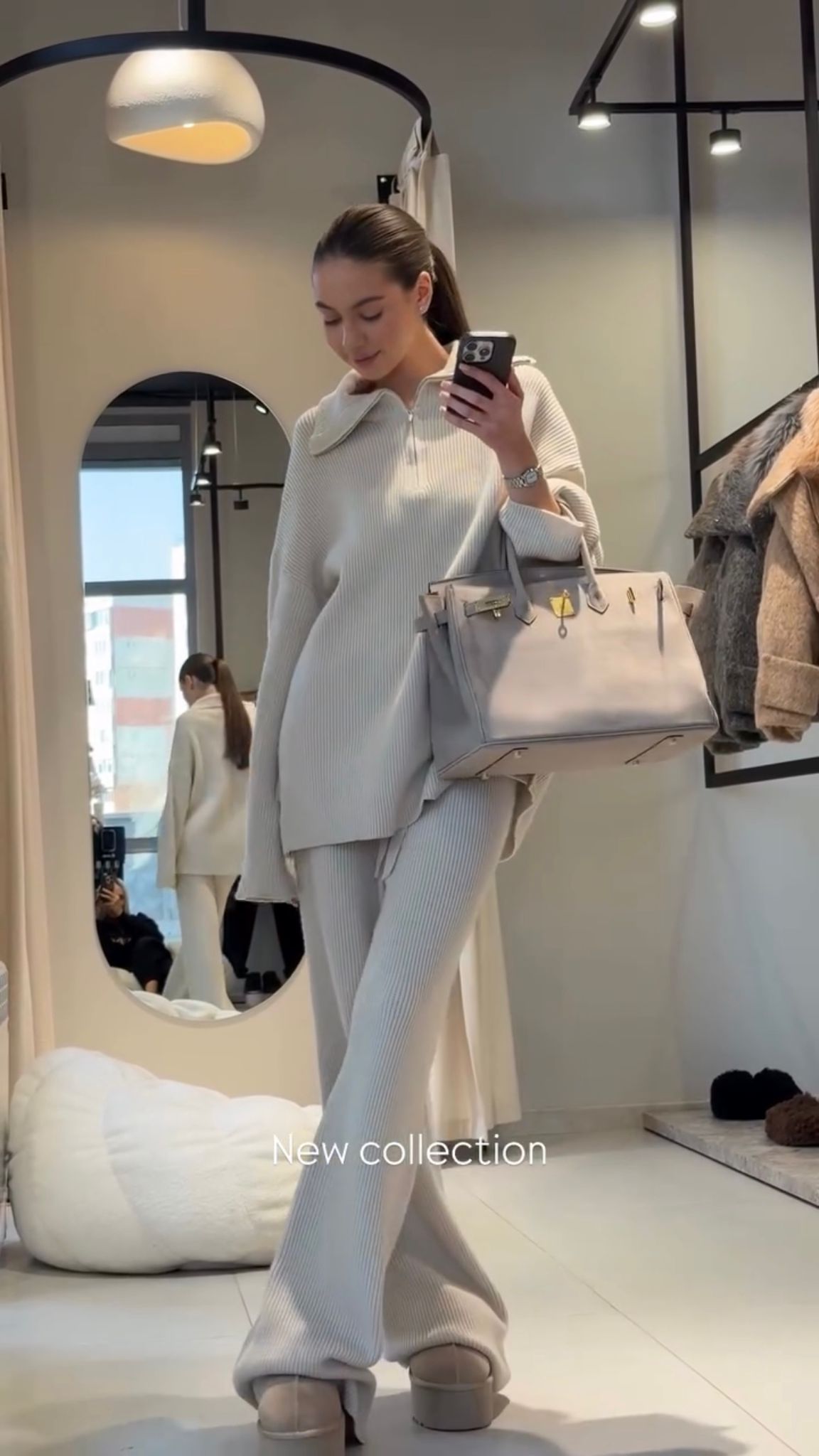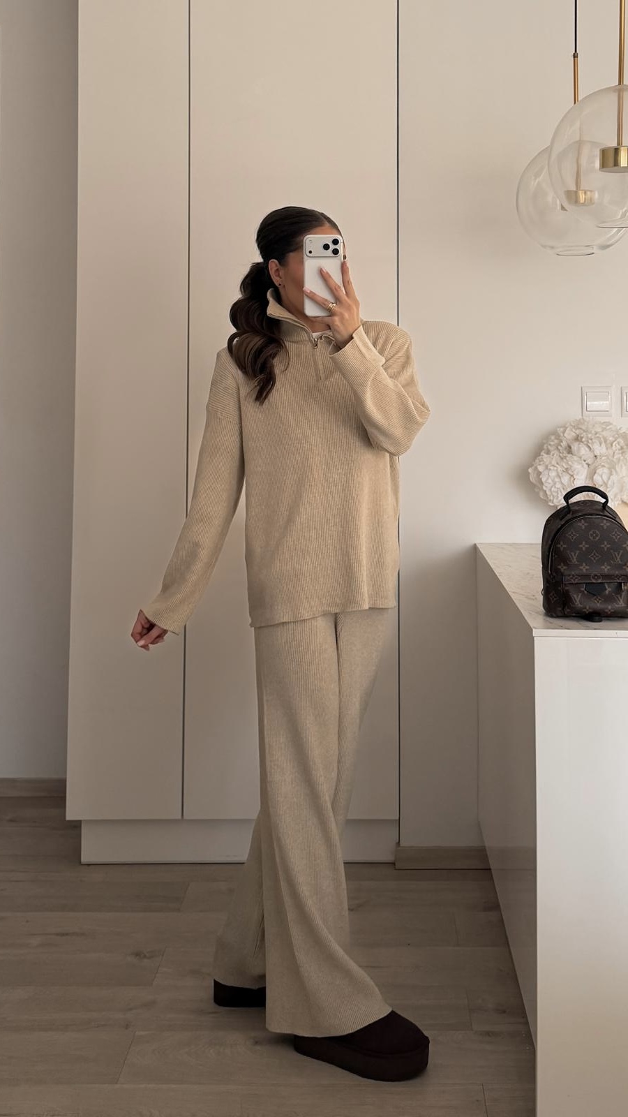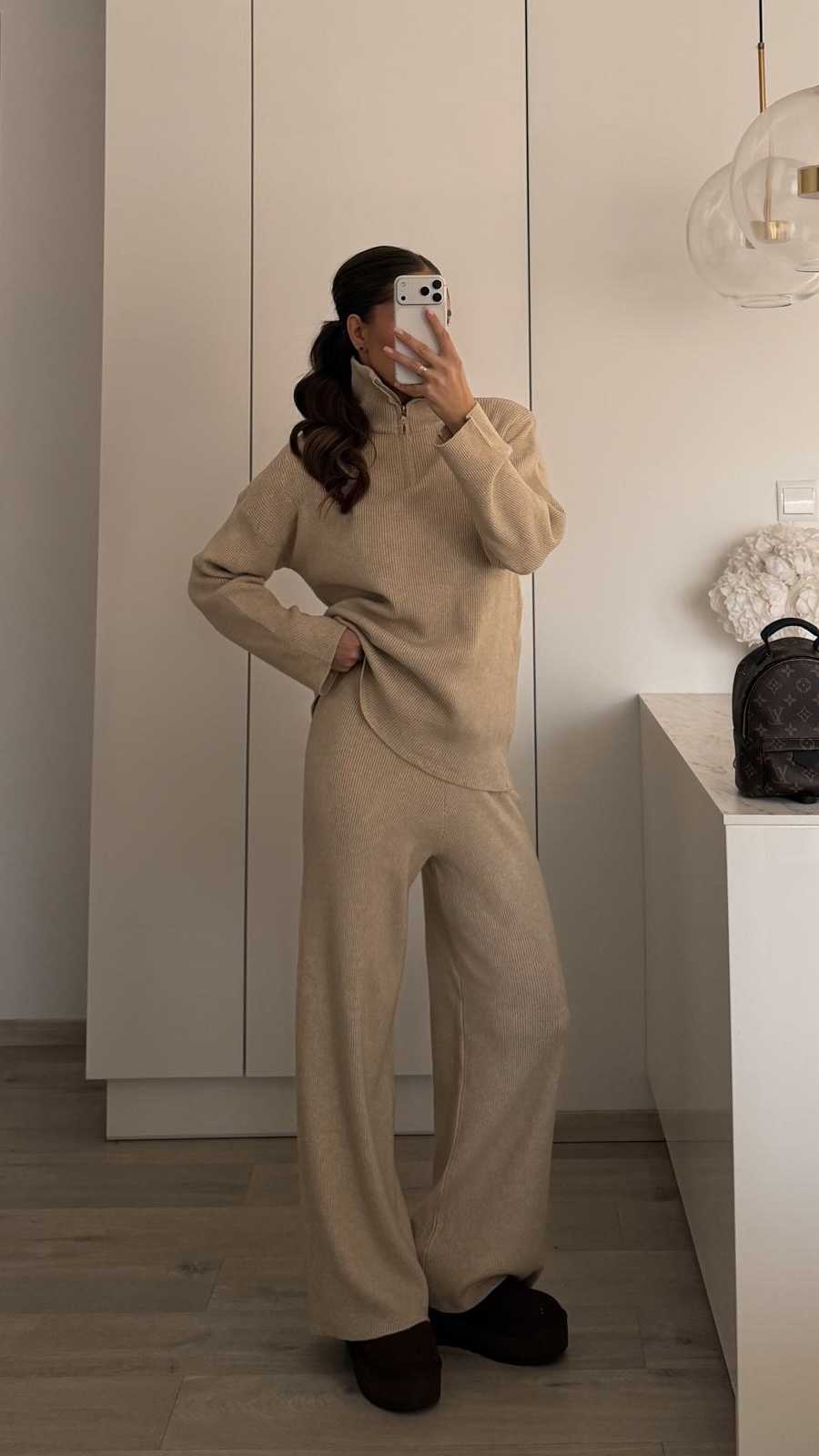Wykonany z elastycznego, prążkowanego materiału, który idealnie dopasowuje się do sylwetki i zapewnia maksymalny komfort noszenia. Góra z wysokim kołnierzem i zamkiem dodaje sportowej elegancji, a proste, szerokie spodnie tworzą efekt dopracowanego total looku.