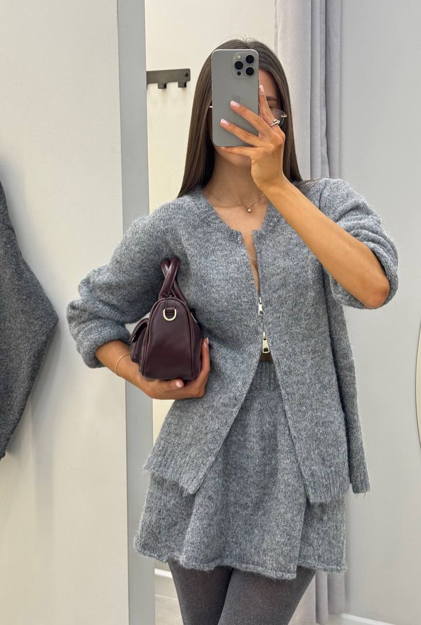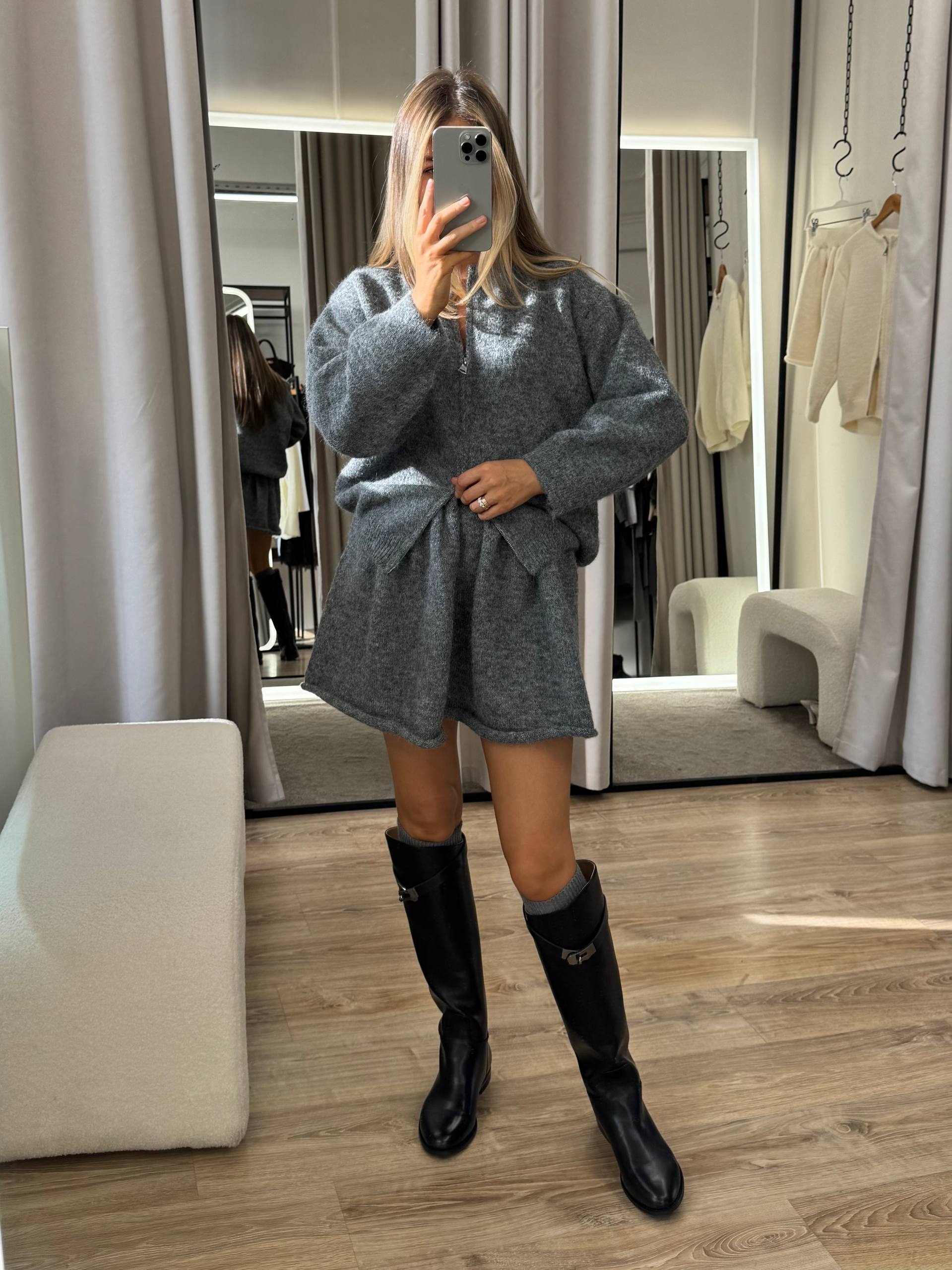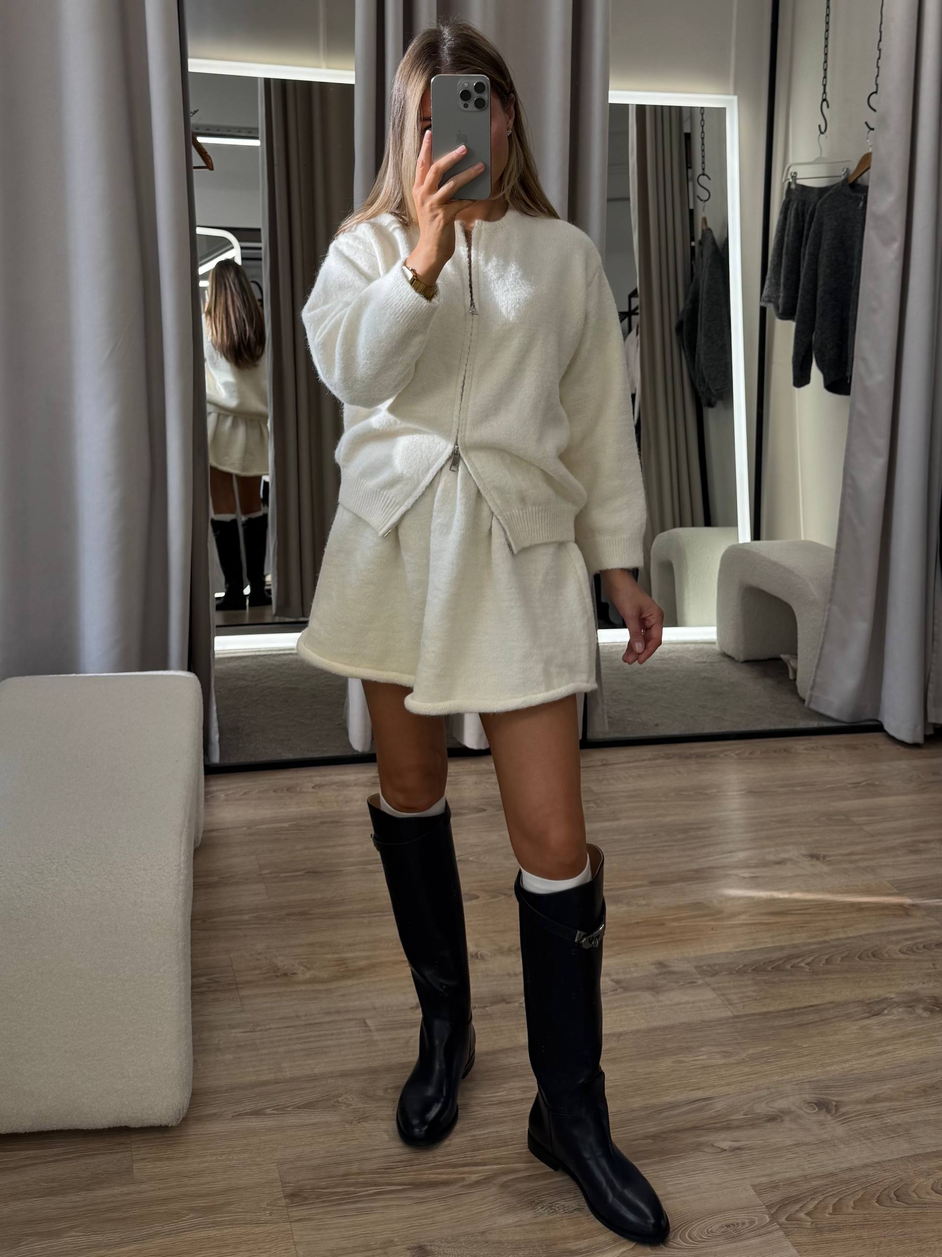 Dopasowana spódniczka z lekkim rozkloszowaniem oraz luźniejsza góra zapinana na suwak tworzą zestaw, który możesz nosić razem lub osobno – w zależności od okazji. Zestaw z kozakami i torebką dla bardziej miejskiego looku albo wybierz sneakersy, by nadać mu casualowego luzu.