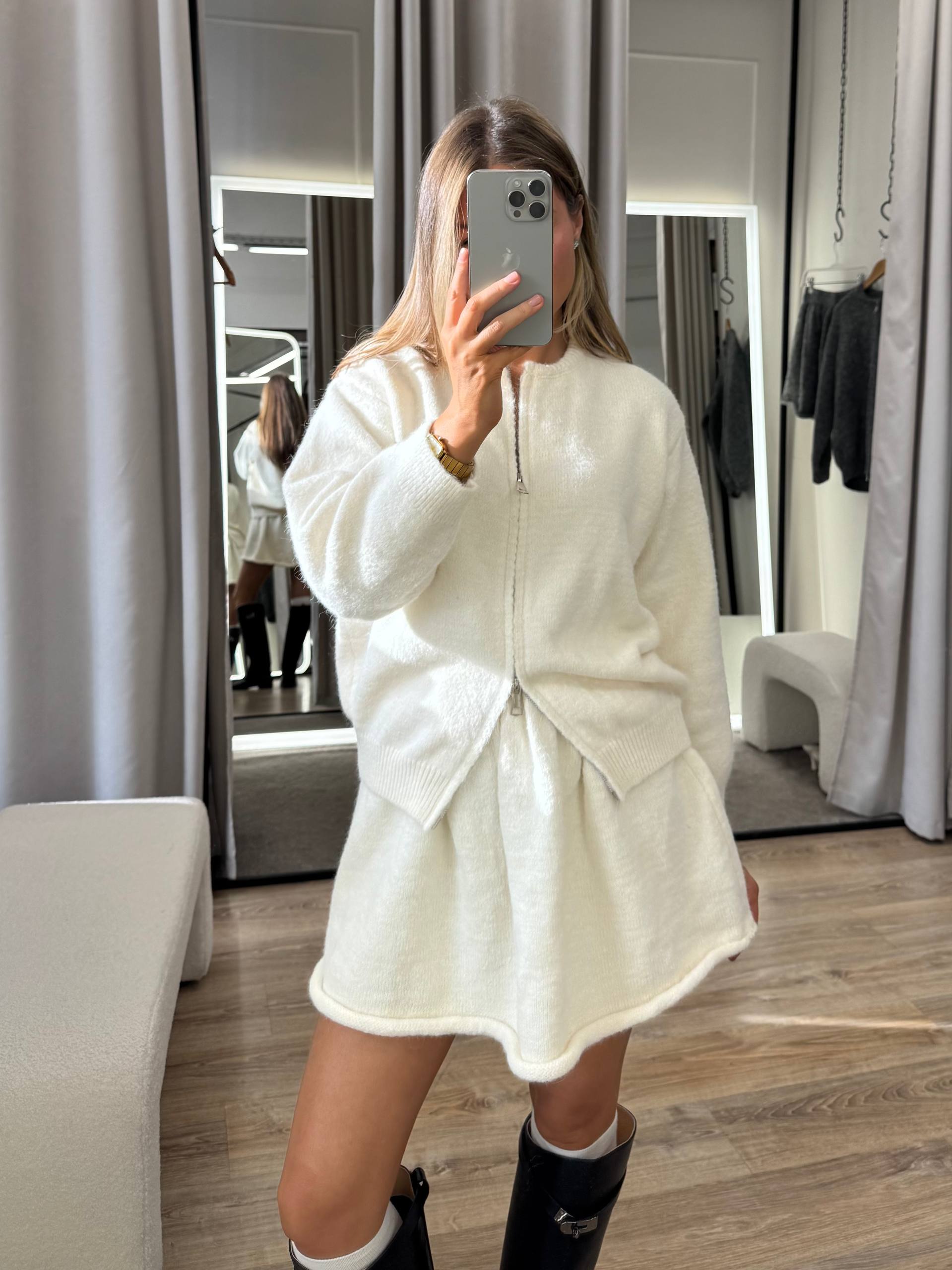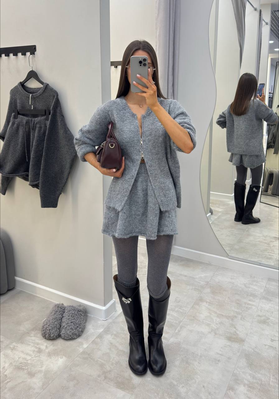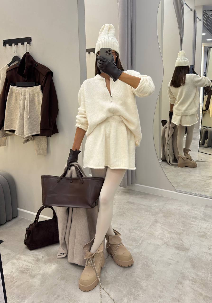 Dopasowana spódniczka z lekkim rozkloszowaniem oraz luźniejsza góra zapinana na suwak tworzą zestaw, który możesz nosić razem lub osobno – w zależności od okazji. Zestaw z kozakami i torebką dla bardziej miejskiego looku albo wybierz sneakersy, by nadać mu casualowego luzu.
