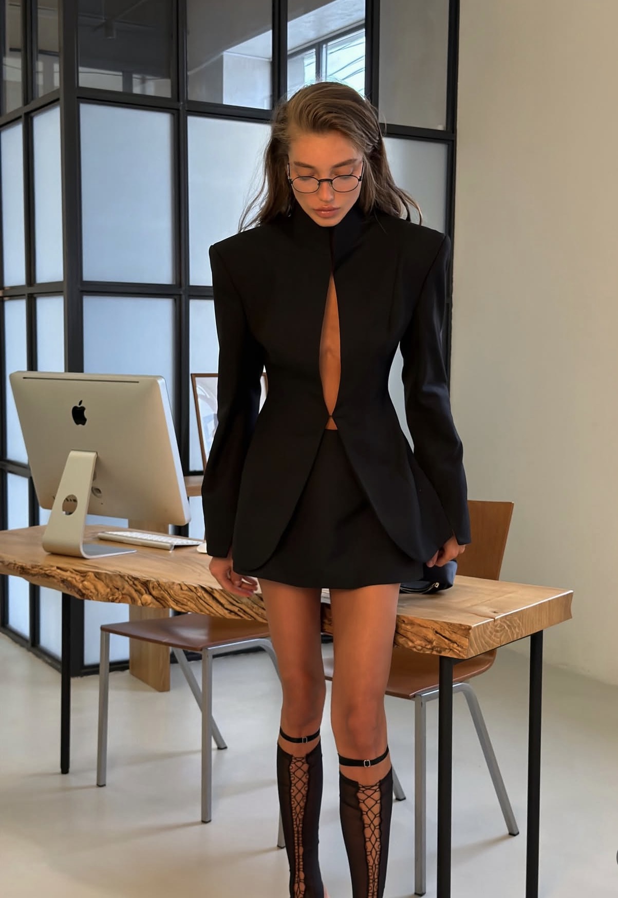 Minimalizm spotyka odważny design. Ta czarna marynarka o perfekcyjnie dopasowanym kroju podkreśla sylwetkę i nadaje jej wyrafinowaną, nowoczesną linię. Wysoki kołnierz oraz subtelne, pionowe rozcięcie z przodu tworzą zmysłowy, ale niezwykle elegancki akcent, który przyciąga spojrzenia.