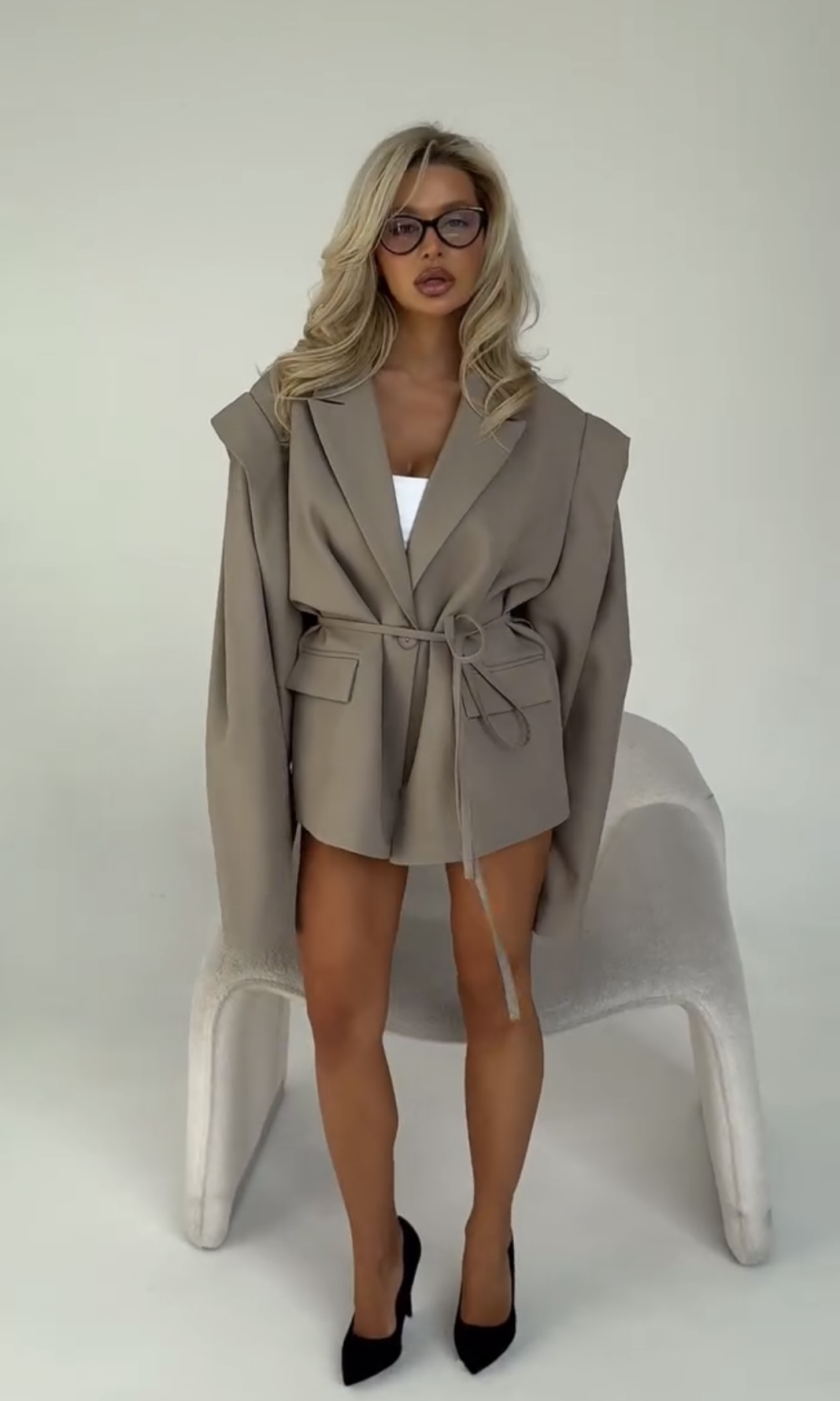 Elegancka oversize’owa marynarka w odcieniu bieli i beżu to połączenie klasyki i nowoczesności. Jej szerokie, mocno zarysowane ramiona nadają strukturę sylwetce, a luźny fason zapewnia komfort noszenia. Subtelne taliowanie podkreślone cienkim paskiem dodaje kobiecości i elegancji. Model posiada klasyczne klapy oraz praktyczne kieszenie z klapkami, które dodają marynarce szykownego charakteru.