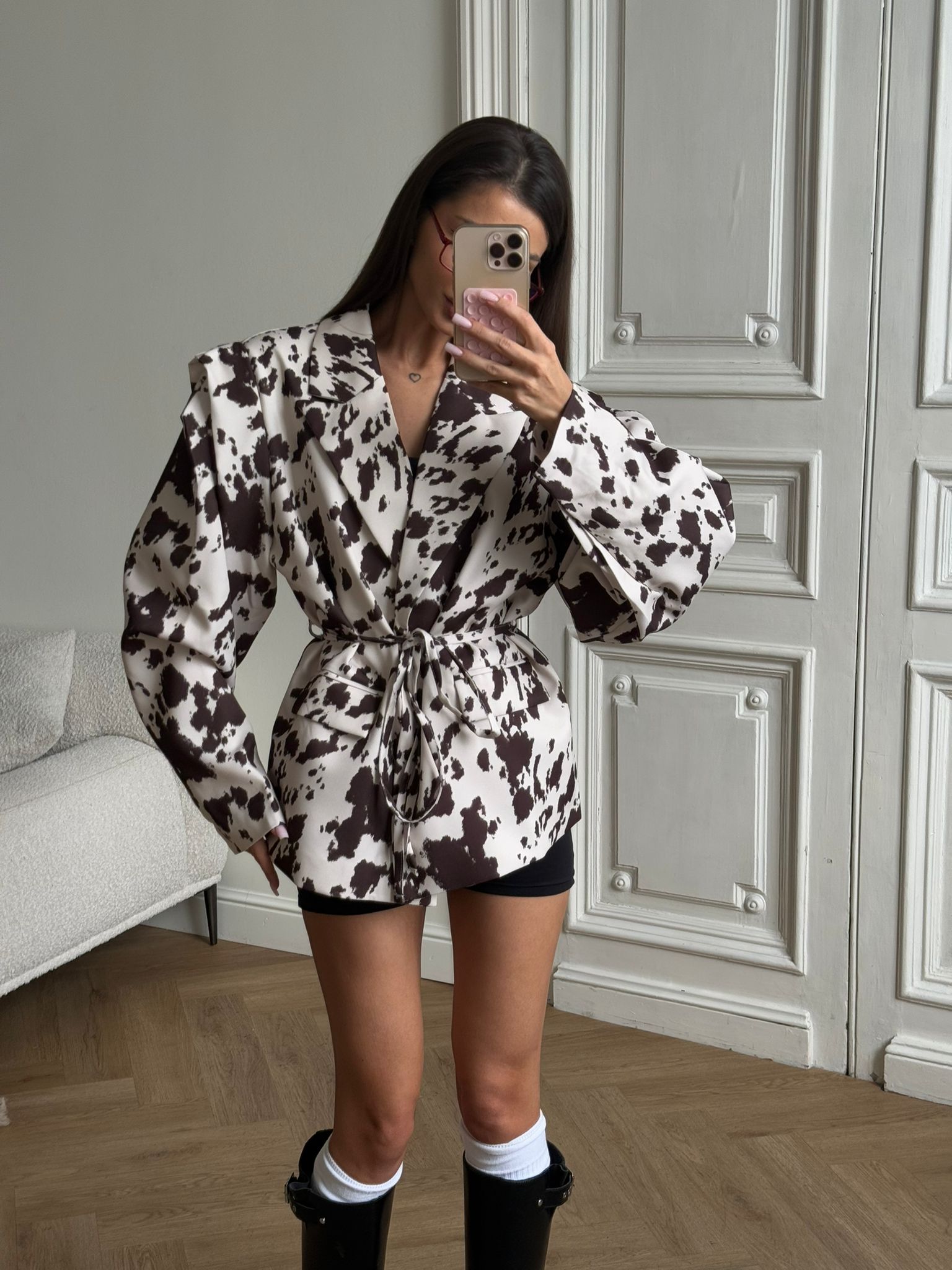 Wyróżnij się niepowtarzalnym printem! Marynarka o oversize’owym kroju z paskiem w talii, który podkreśla sylwetkę i nadaje całości kobiecego charakteru. Efektowna, ale wygodna w noszeniu.