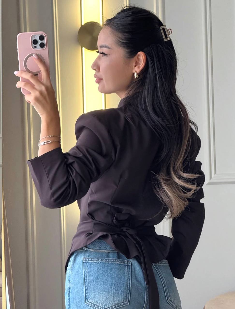 Nowoczesna forma spotyka klasyczną elegancję. Ta wyjątkowa marynarka została zaprojektowana tak, aby perfekcyjnie modelować talię i nadawać sylwetce proporcji. Głęboki dekolt w kształcie litery V oraz subtelne zapięcie na guziki tworzą zmysłowy, ale wciąż wyrafinowany efekt.
