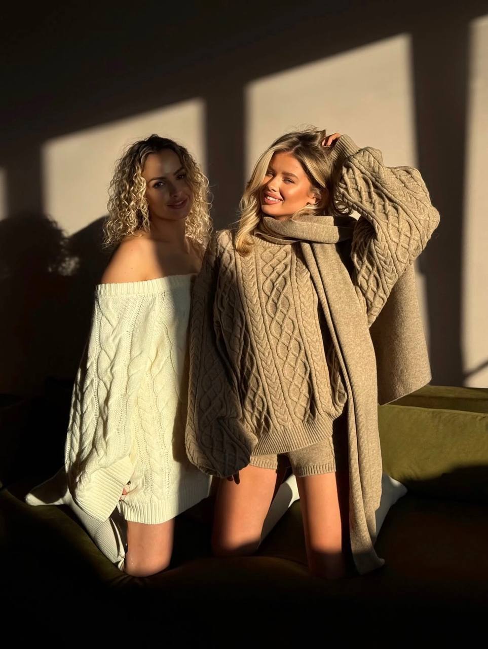 Ten zestaw po połączenie oversize'owego swetra o pięknym splocie, dopasowanych szortów i miękkiego szalika. Całość tworzy przytulny i stylowy komplet, który wyróżnia się teksturą.