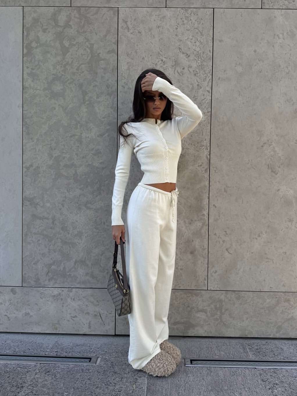 Minimalistyczny, a jednocześnie pełen charakteru komplet dzianinowy, który podkreśla sylwetkę i zapewnia komfort noszenia przez cały dzień. Składa się z dopasowanego kardiganu zapinanego na guziki oraz prostych spodni z elastyczną talią i wiązaniem.