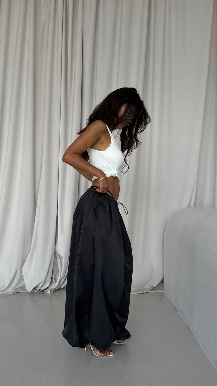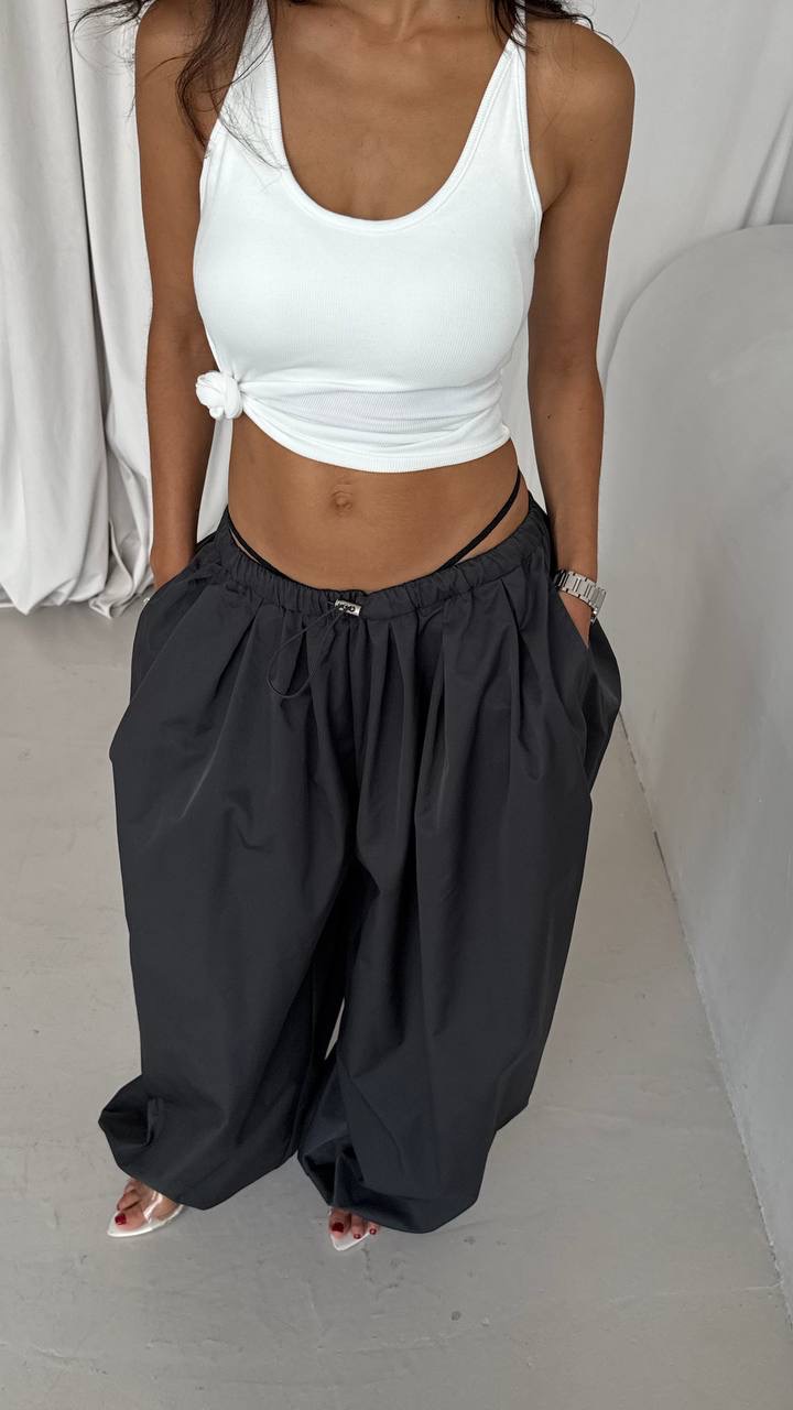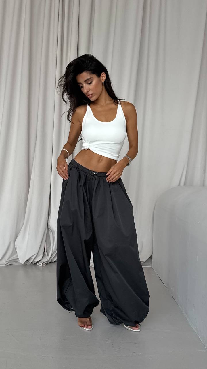 Wykonane z lekkiego materiału, o kroju balloon/parachute idealnie układają się na sylwetce, tworząc charakterystyczny, objętościowy kształt. Elastyczna talia gwarantuje komfort noszenia, a szerokie nogawki z ściągaczami nadają im charakteru w stylu street chic.