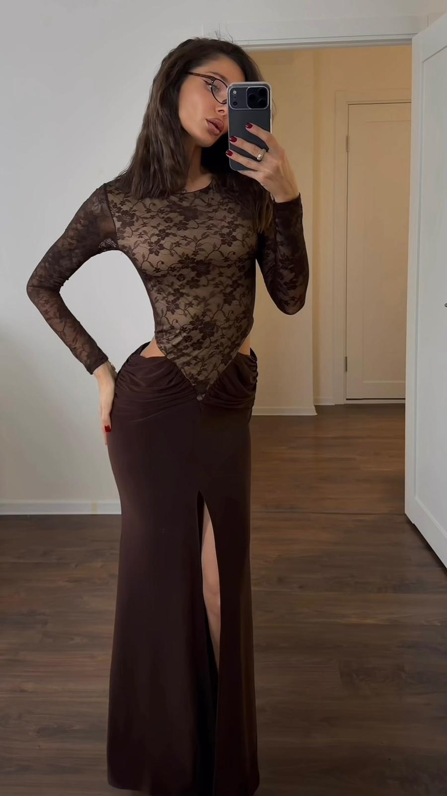 Ciekawym akcentem są koronkowe rękawy, które dodają całości dynamiki i finezji, nie ograniczając przy tym komfortu noszenia. Dół sukienki delikatnie się rozszerza, tworząc naturalny, zwiewny efekt przy każdym kroku, dzięki czemu całość wygląda lekko i elegancko.