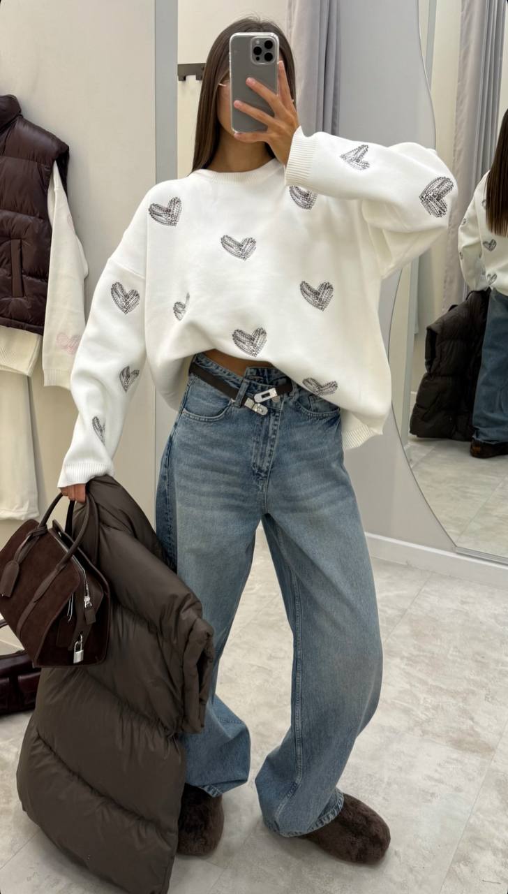Ten biały oversize’owy sweter z serduszkowym wzorem to idealne połączenie wygody i stylu. Miękki, przyjemny w dotyku materiał sprawia, że będziesz czuć się komfortowo przez cały dzień, a luźny krój dodaje nonszalancji i świetnie wpisuje się w casualowe stylizacje.