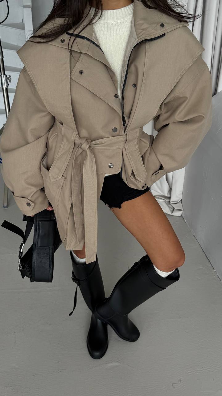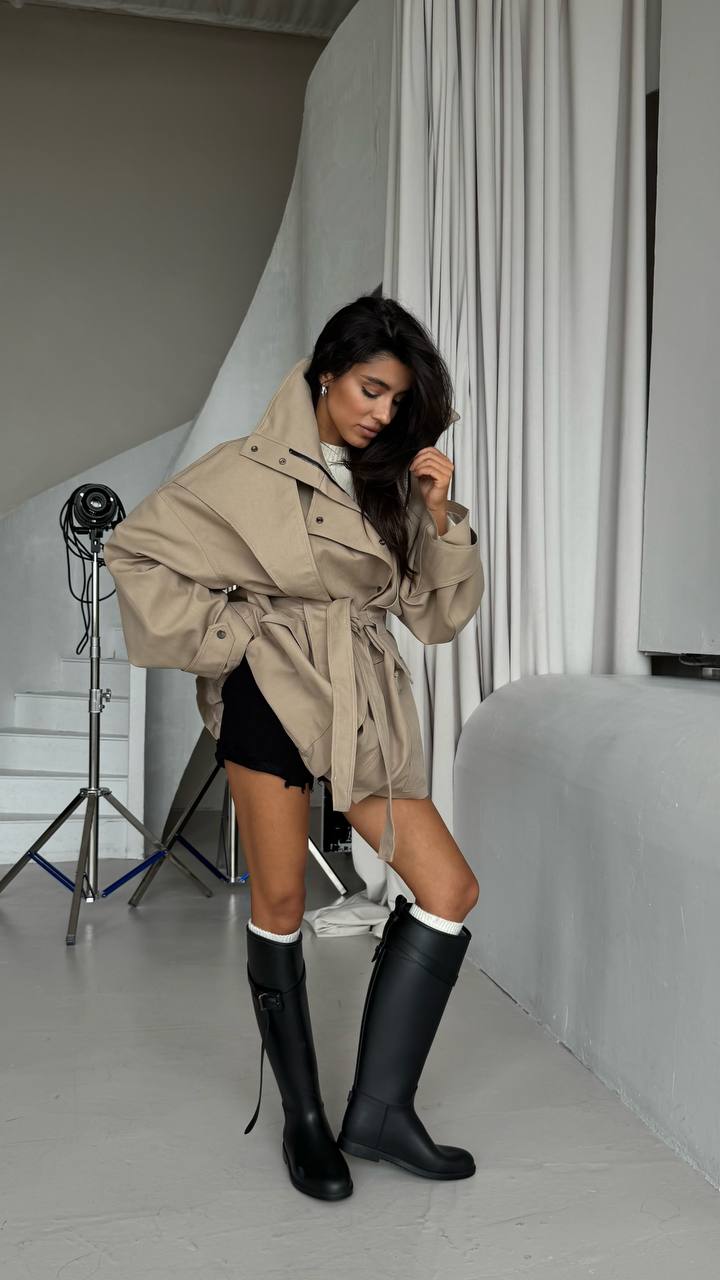Oversize'owy trencz o prostym kroju, wykonany z matowej tkaniny o przyjemnej strukturze. Subtelna forma, stonowany beż i funkcjonalne detale – szeroki kołnierz, pasek w talii, praktyczne kieszenie. Idealny na przejściowe dni. Styl, który nie potrzebuje dodatków.