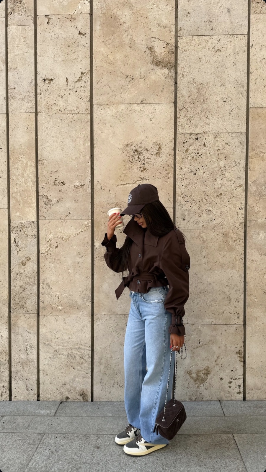 Ten beżowy trencz to kwintesencja nowoczesnej elegancji i ponadczasowego stylu. Jego krótki, perfekcyjnie skrojony fason podkreśla talię, nadając sylwetce kobiece proporcje i lekkość. Dwurzędowe zapięcie, wyrazisty kołnierz oraz pasek z klamrą tworzą luksusowy, dopracowany w każdym detalu design.